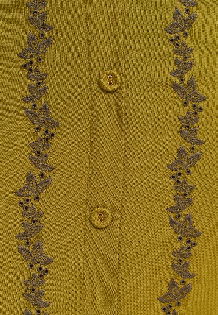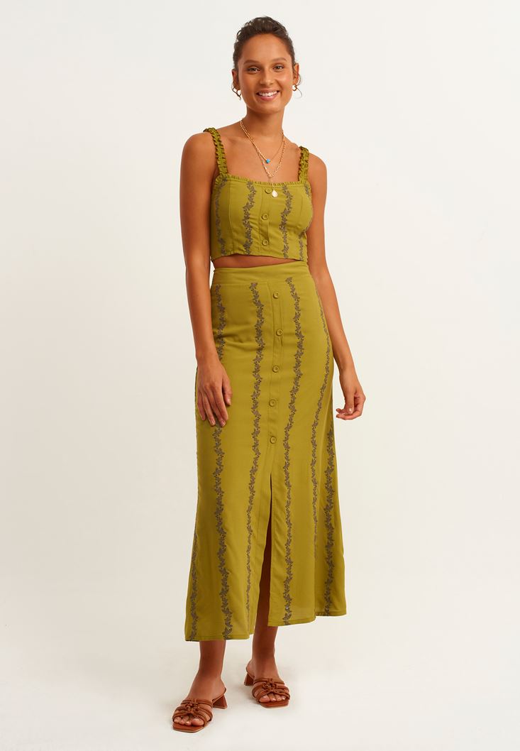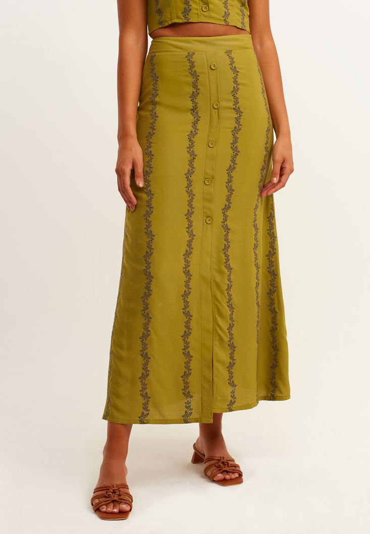 %100 viskon içerikli, yüksek bel, önü düğmeli, maxi boy, beden boyunca nakışlı, A-line etek kesimi.