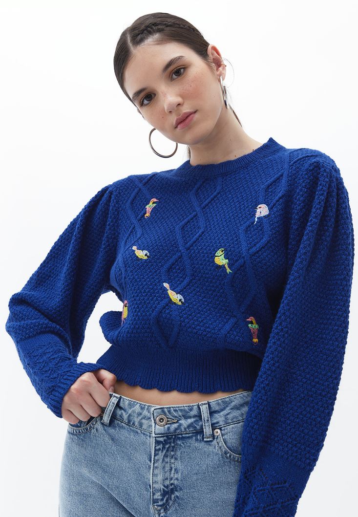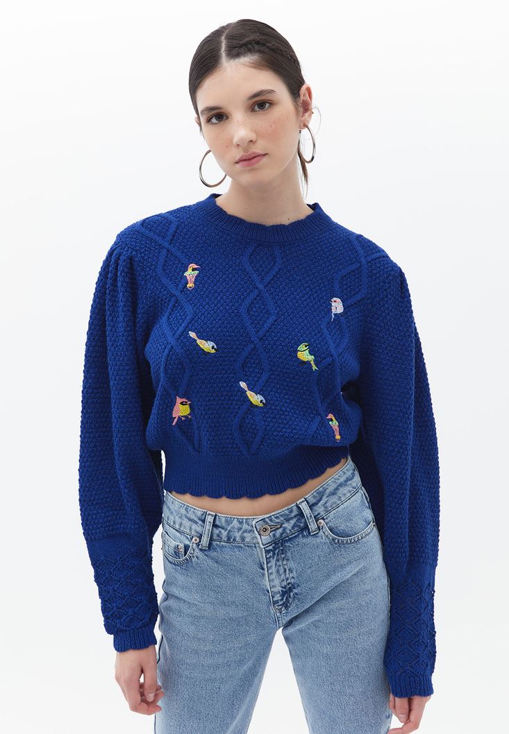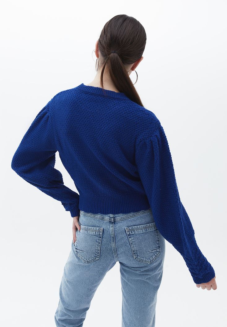 Özel dokulu triko örgü, ön kısmı örgü oyunlu ve nakış detaylı, sıfır yaka, balon kollu, crop kesim, kol ucu örgü detaylı.