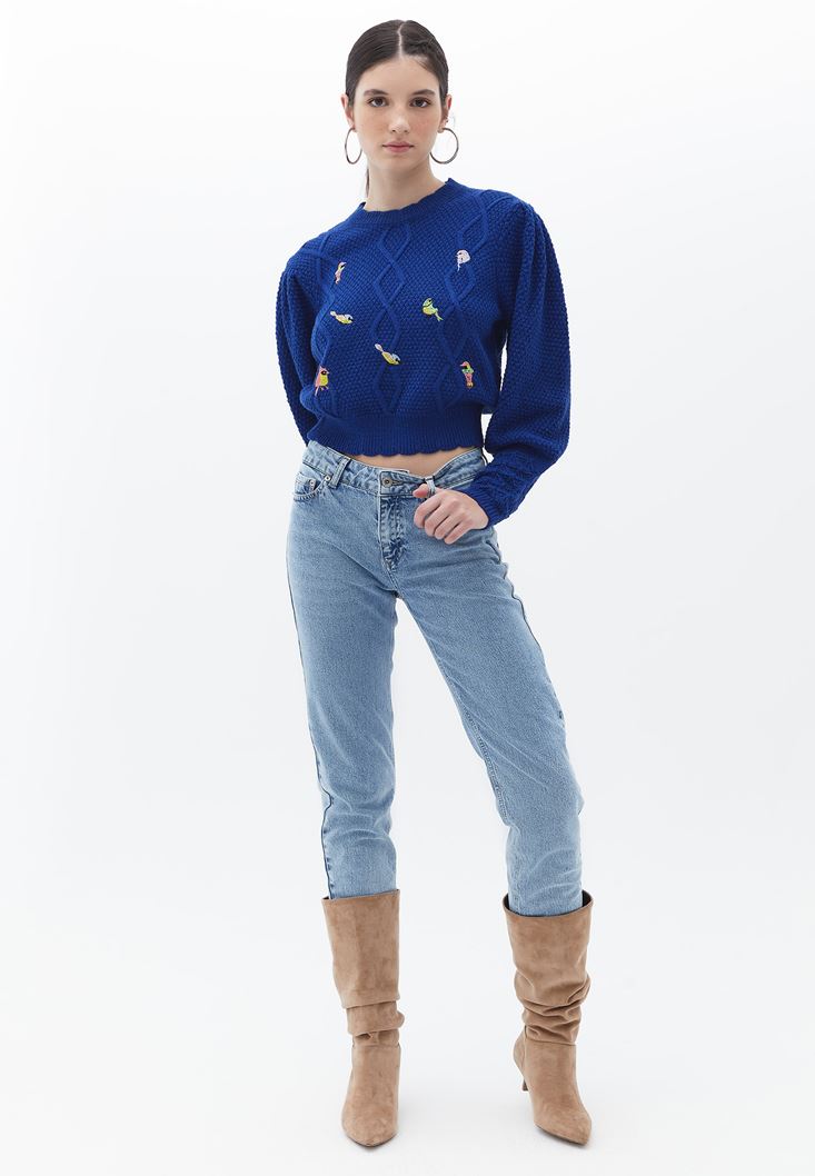 • Bayan Lacivert Nakış Detaylı Triko Kazak