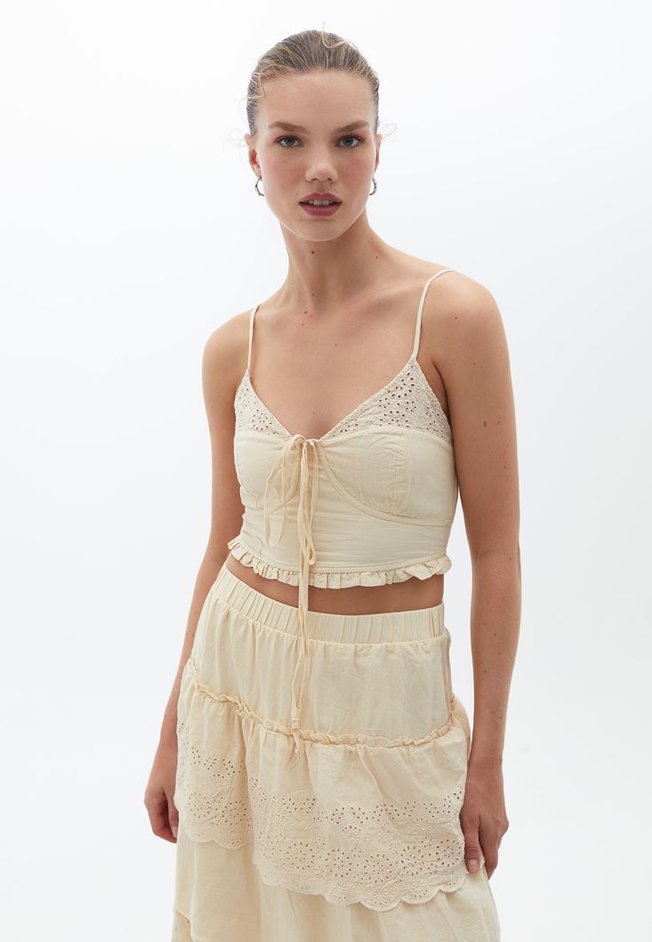 • Bayan Bej Nakış Detaylı ve Bağlamalı Crop Top