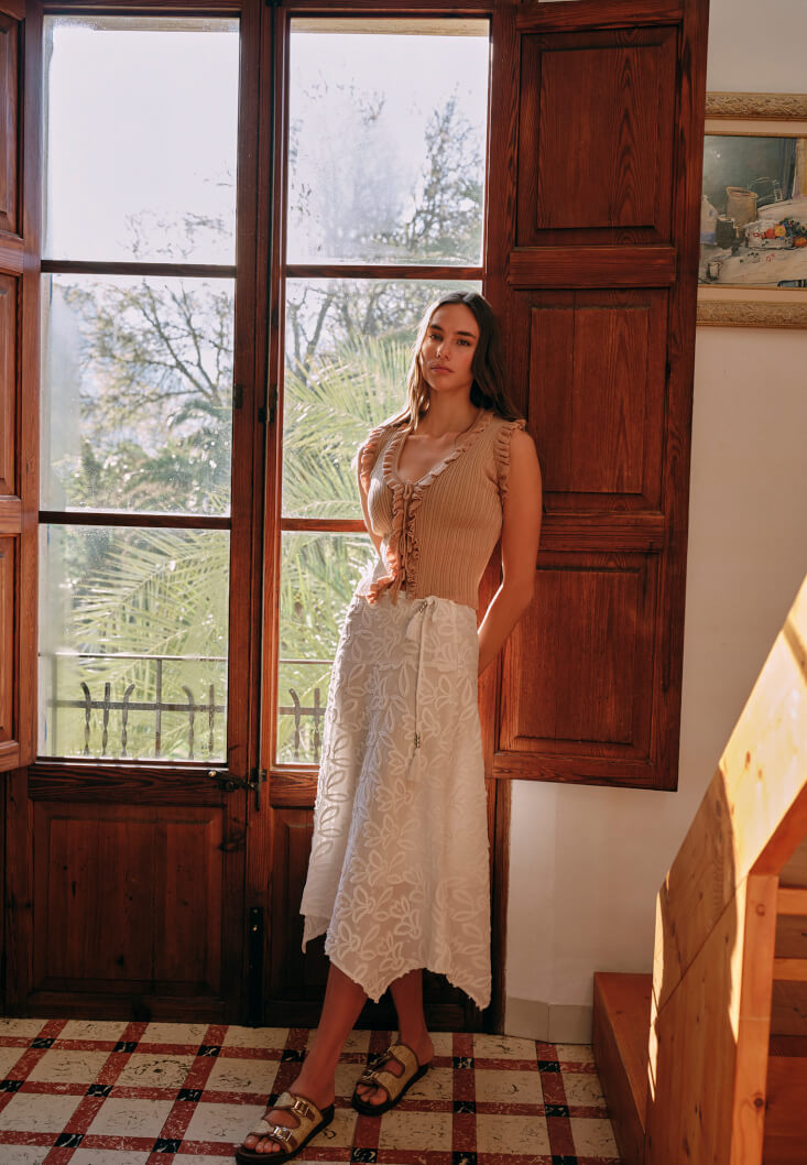 %100 pamuk içerikli doğal doku, nakış işlemeli, yüksek bel, midi boy, kemer detaylı, asimetrik a kesim, içi astarlı, arka bel kısmı fermuar kapamalı.