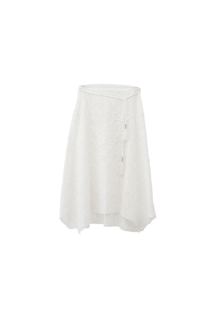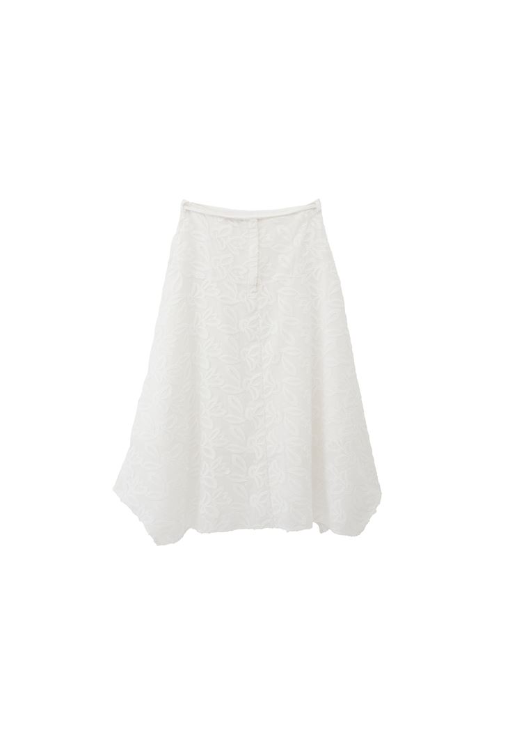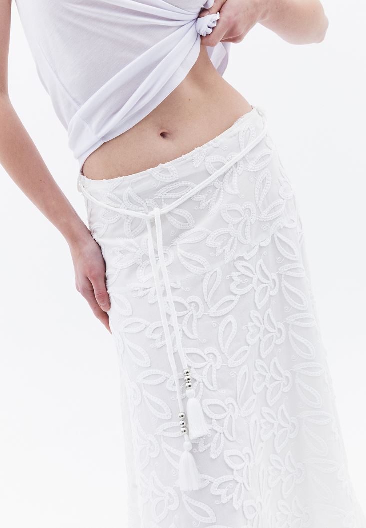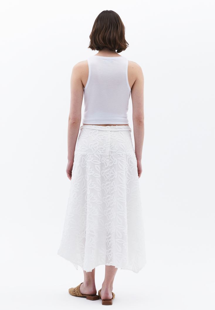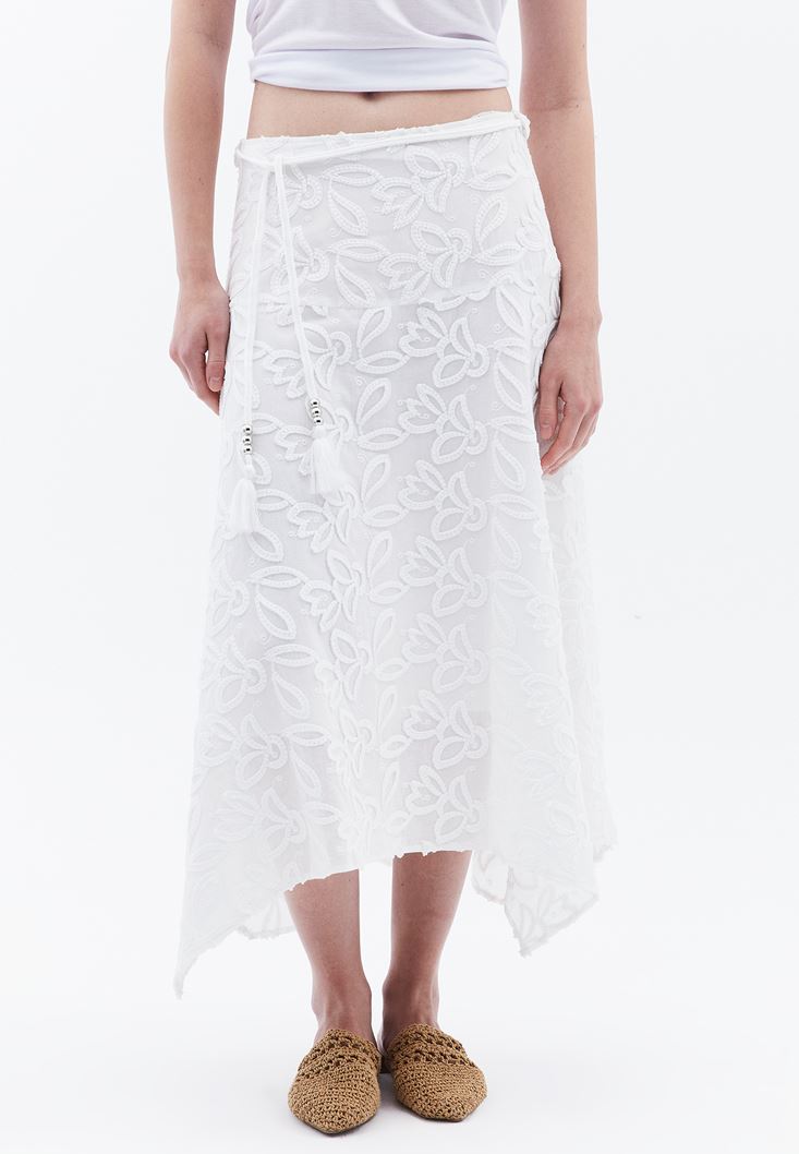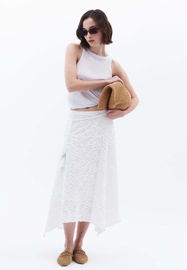 Beyaz Nakışlı Asimetrik Midi Etek