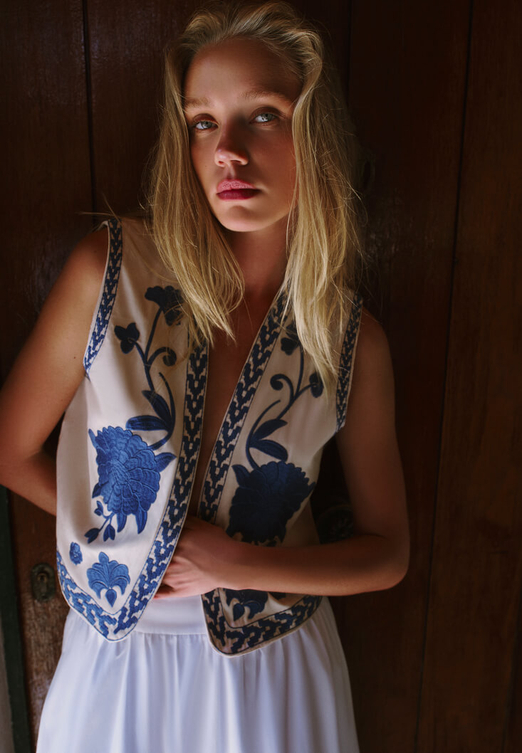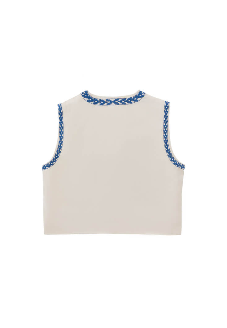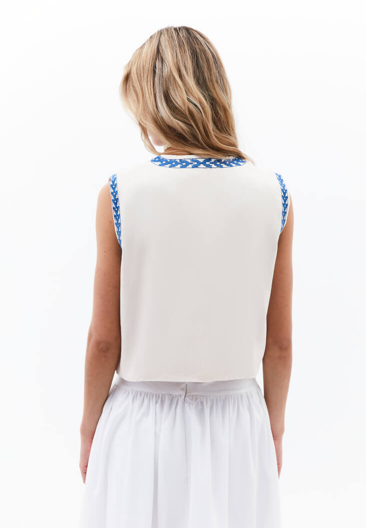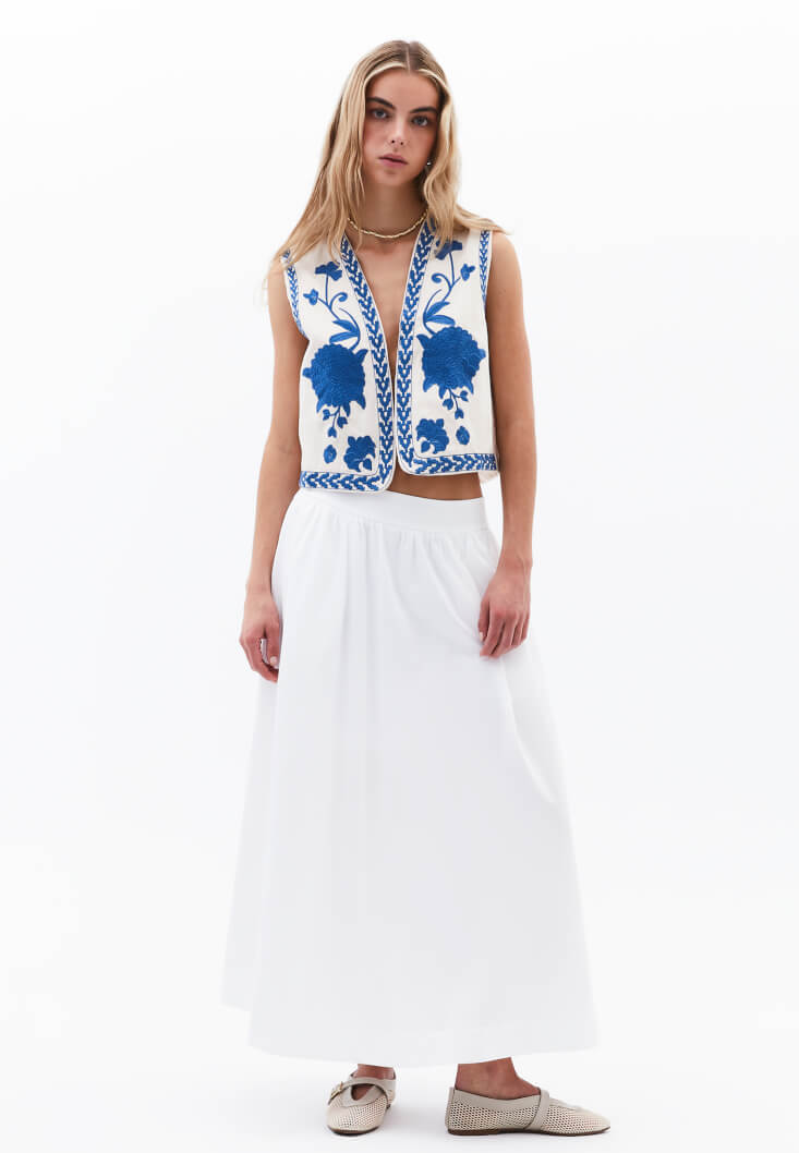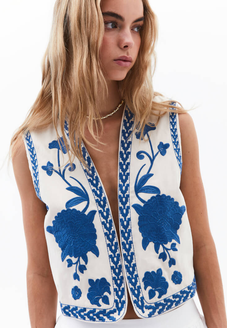 Canlı renkli nakış işlemeleriyle dikkat çeken bu crop yelek, etnik esintileri modern bir stil anlayışıyla buluşturuyor. %100 pamuklu yapısı ve renkli nakış işlemeleriyle yaz kombinlerinize özgün ve enerjik bir dokunuş kazandırıyor.