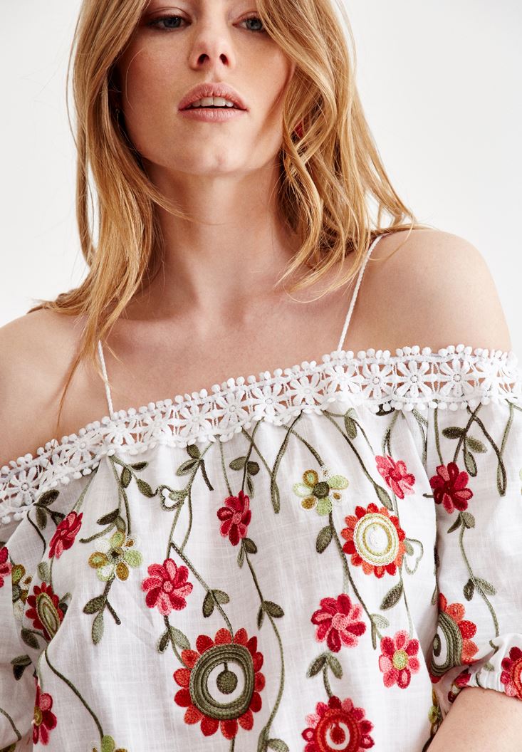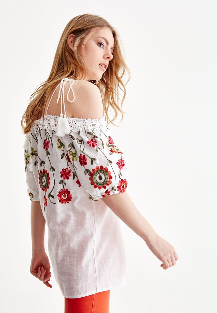 • Bayan Krem Nakışlı Düşük Omuz Bluz