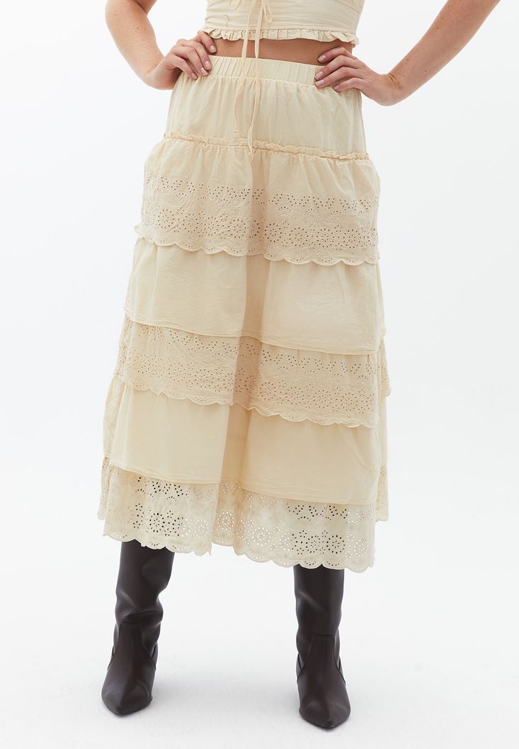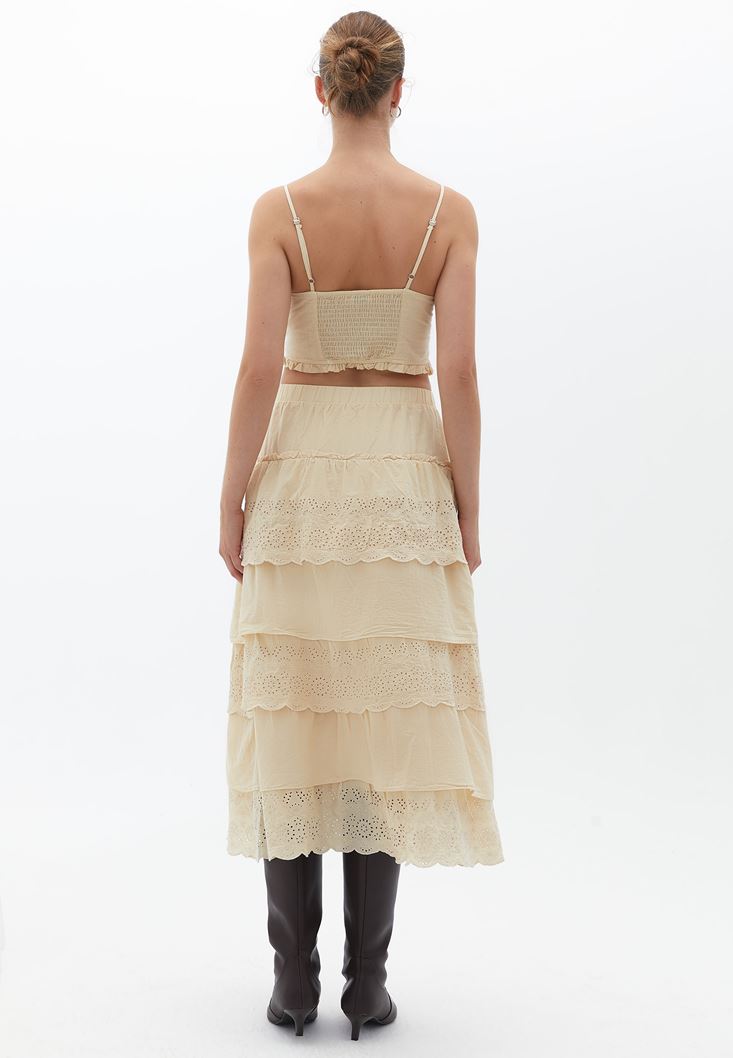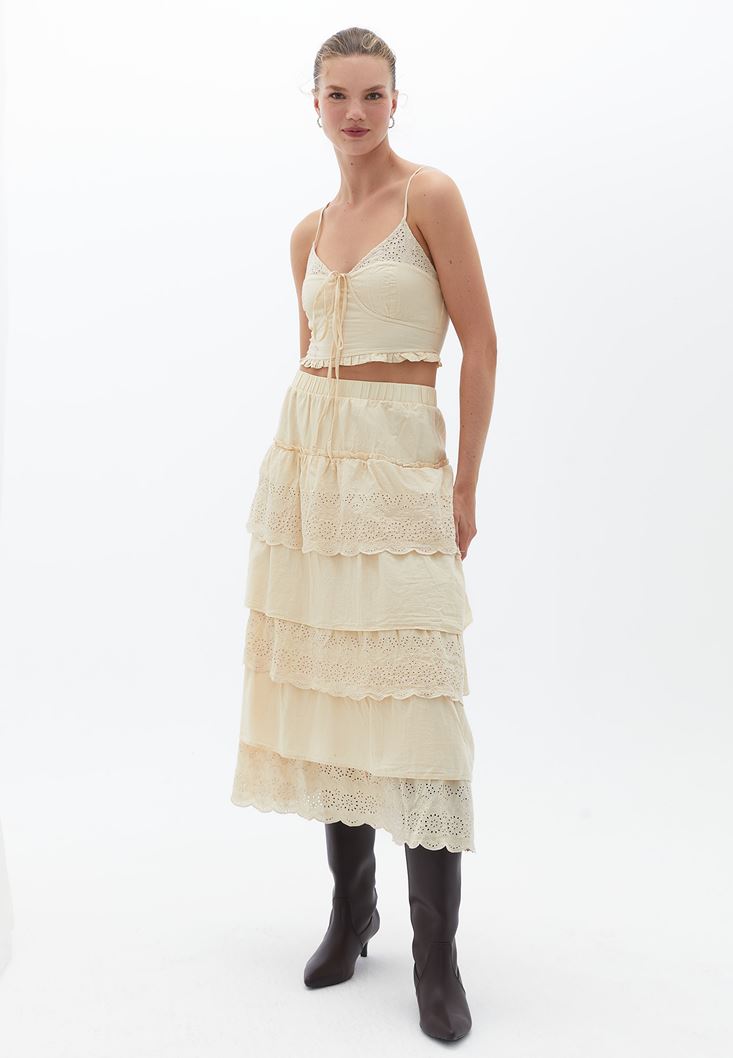 %100 pamuklu doğal içerik, yüksek bel, katlı ve volanlı tasarım, a kesim, beli lastikli, düz ve nakışlı doku karışımlı, midi boy.