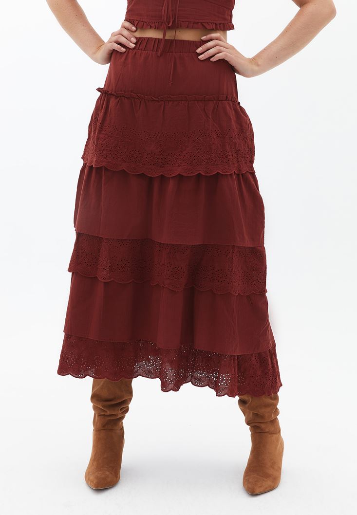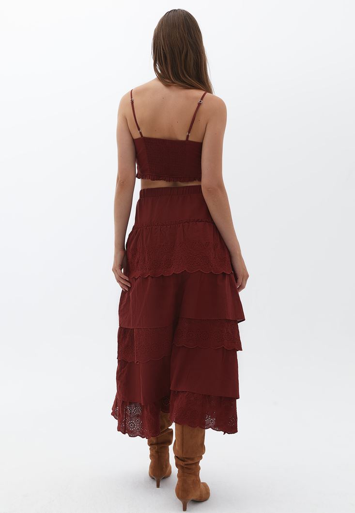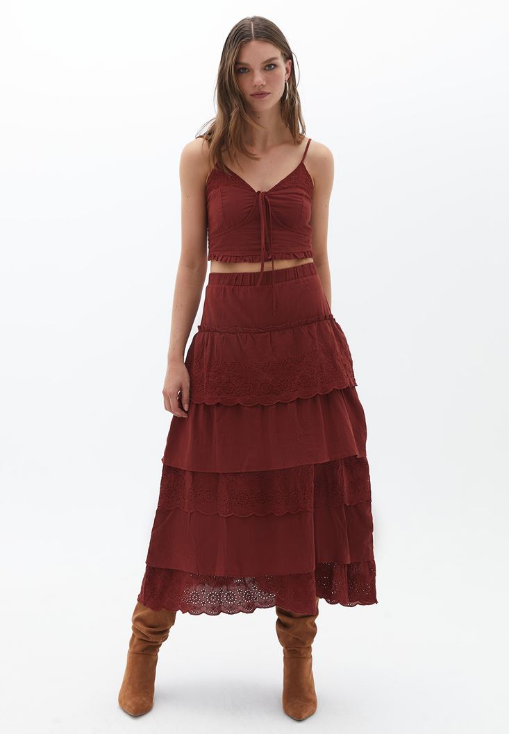 %100 pamuklu doğal içerik, yüksek bel, katlı ve volanlı tasarım, a kesim, beli lastikli, düz ve nakışlı doku karışımlı, midi boy.