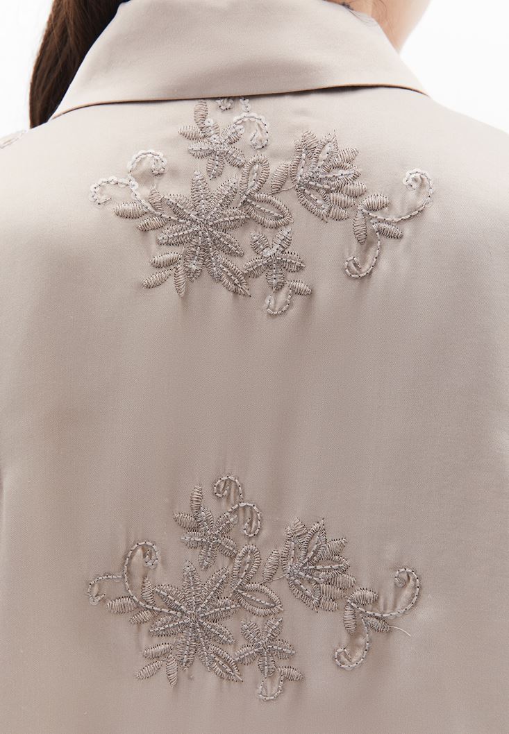 %100 viskon içerikli saten doku, bedenden uzak loose fit, nakış işleme detaylı, uzun kollu, önü kısa arkası uzun asimetrik kesim, düğme kapamalı.