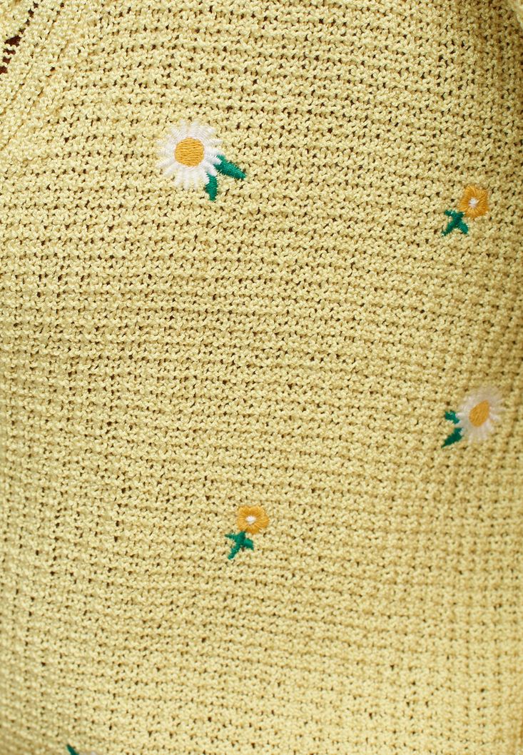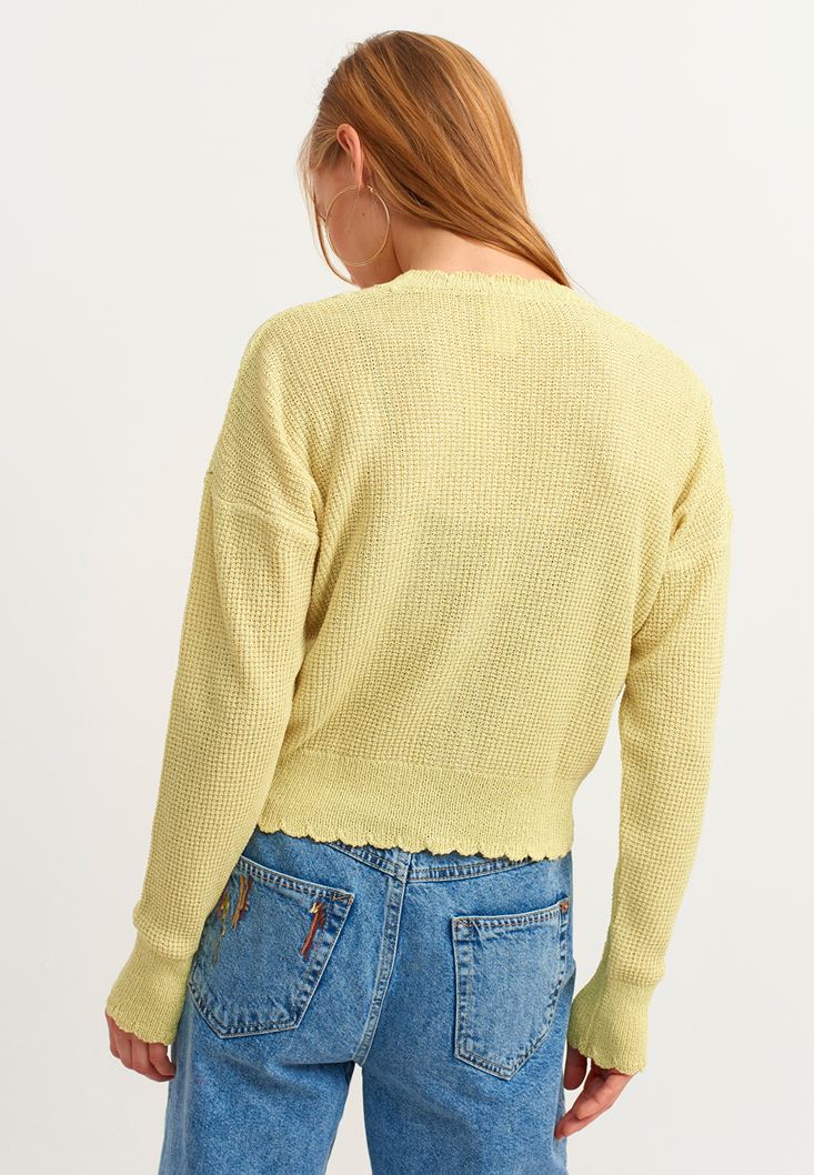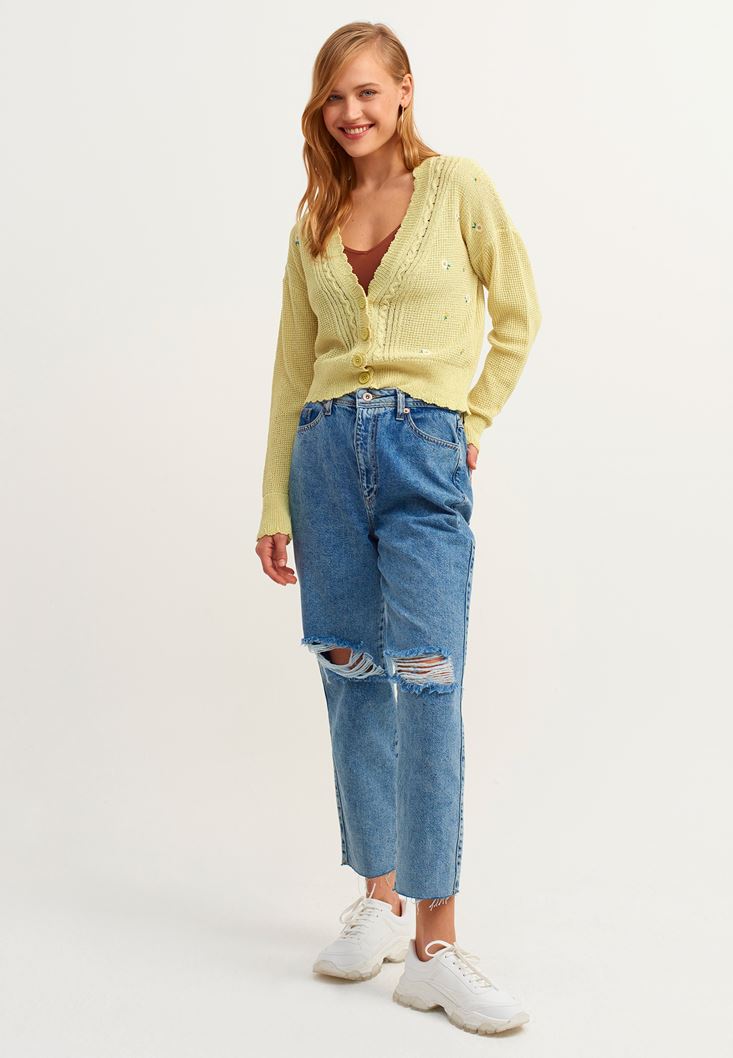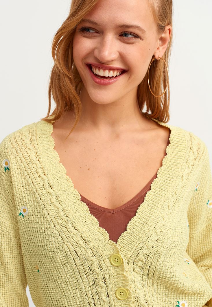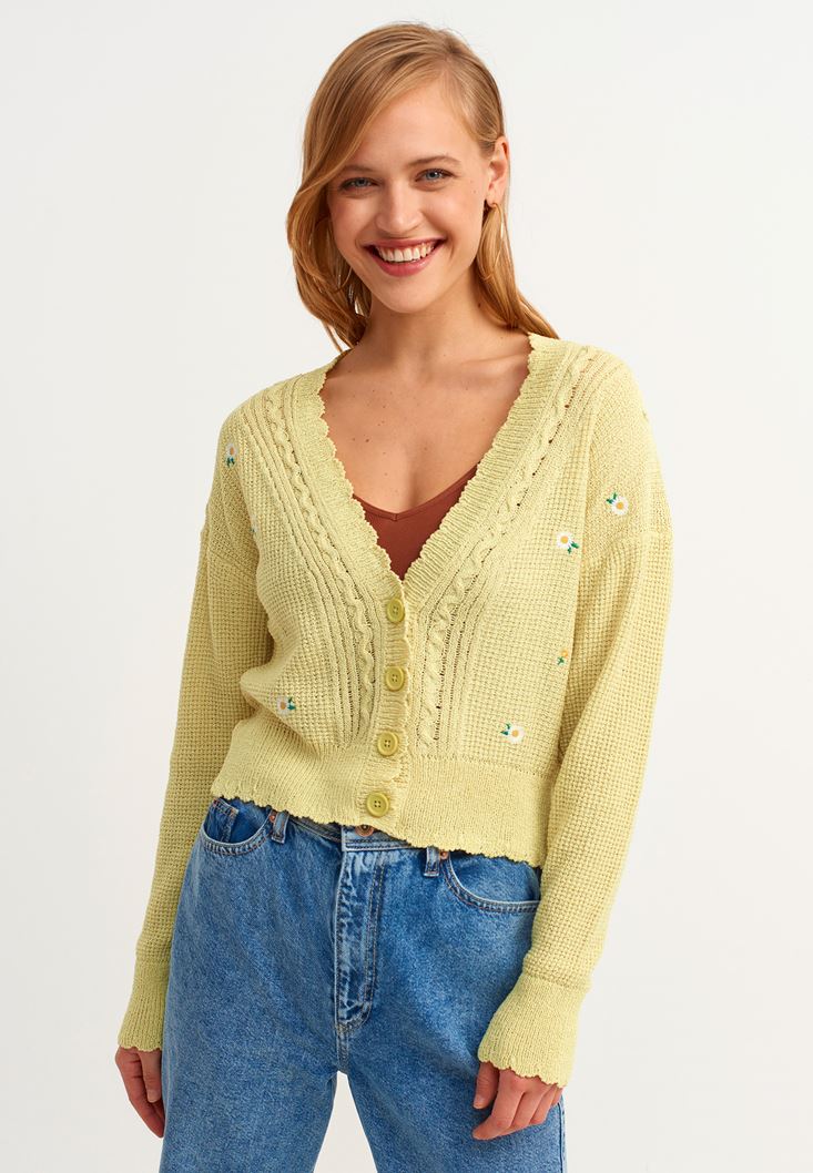 • Bayan Sarı Nakışlı ve Düğmeli Triko Hırka