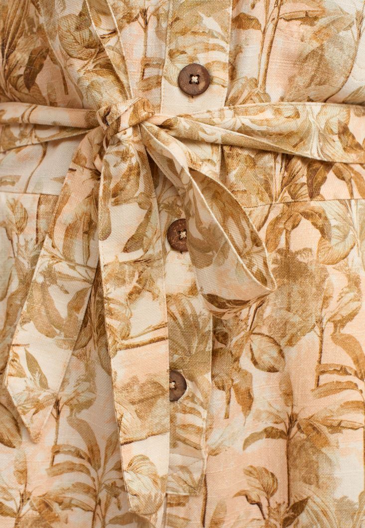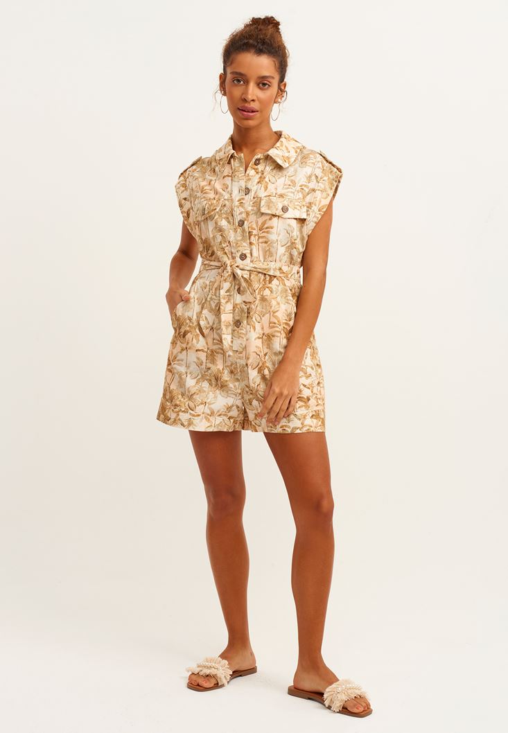 Keten, pamuk ve viskon karışımlı doku, ön kısmı düğmeli, kendi kumaşından kuşak detaylı, apoletli ve kapaklı cepli, şort kısmı iki cepli, floral desenli.
