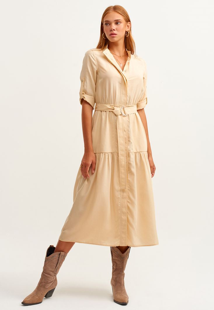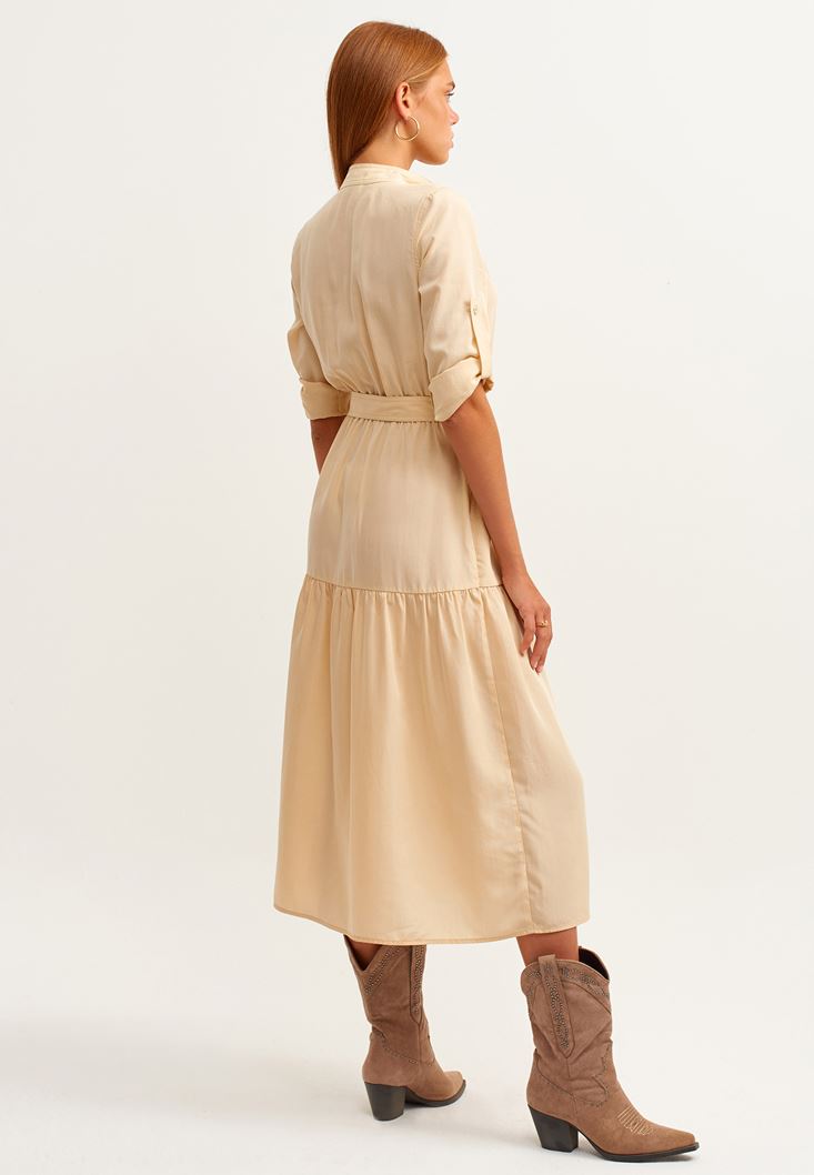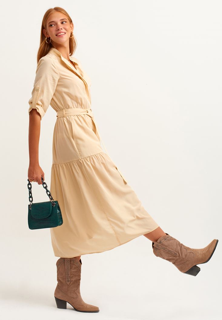 • Bayan Bej Nature Friendly Kemerli Midi Elbise ( TENCEL™ )
