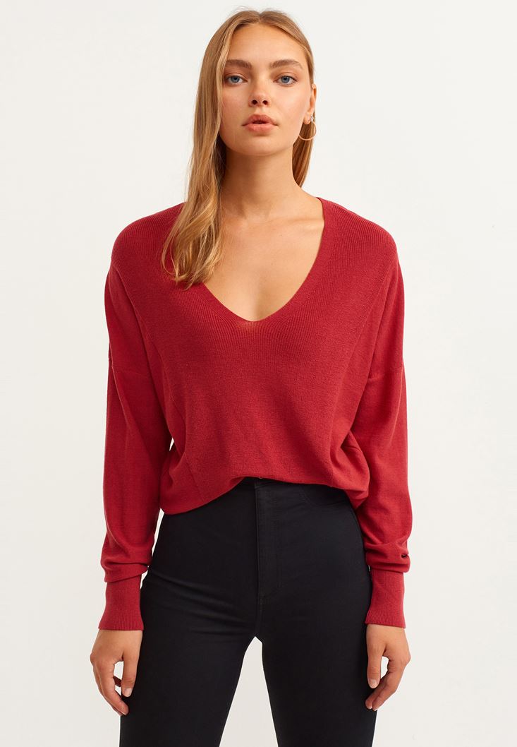 • Bayan Bordo Nature Friendly V-Neck Triko ( TENCEL™ )