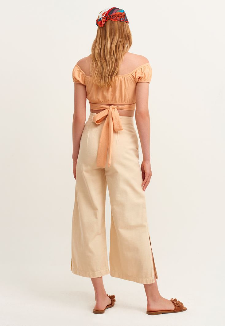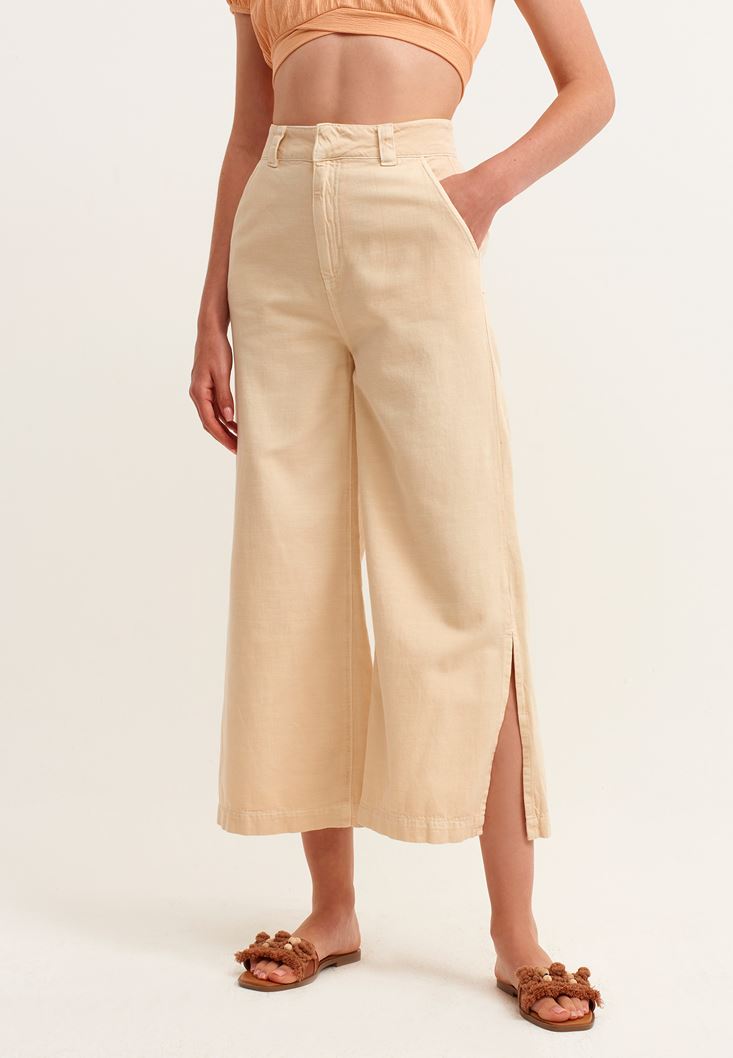 Pamuk ve keten karışımlı özel doku, yüksek bel, paçaları yırtmaçlı, ön kısmı iki cepli, culotte-fit, geniş paça.