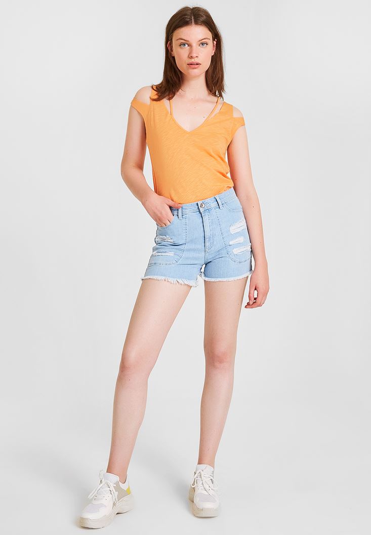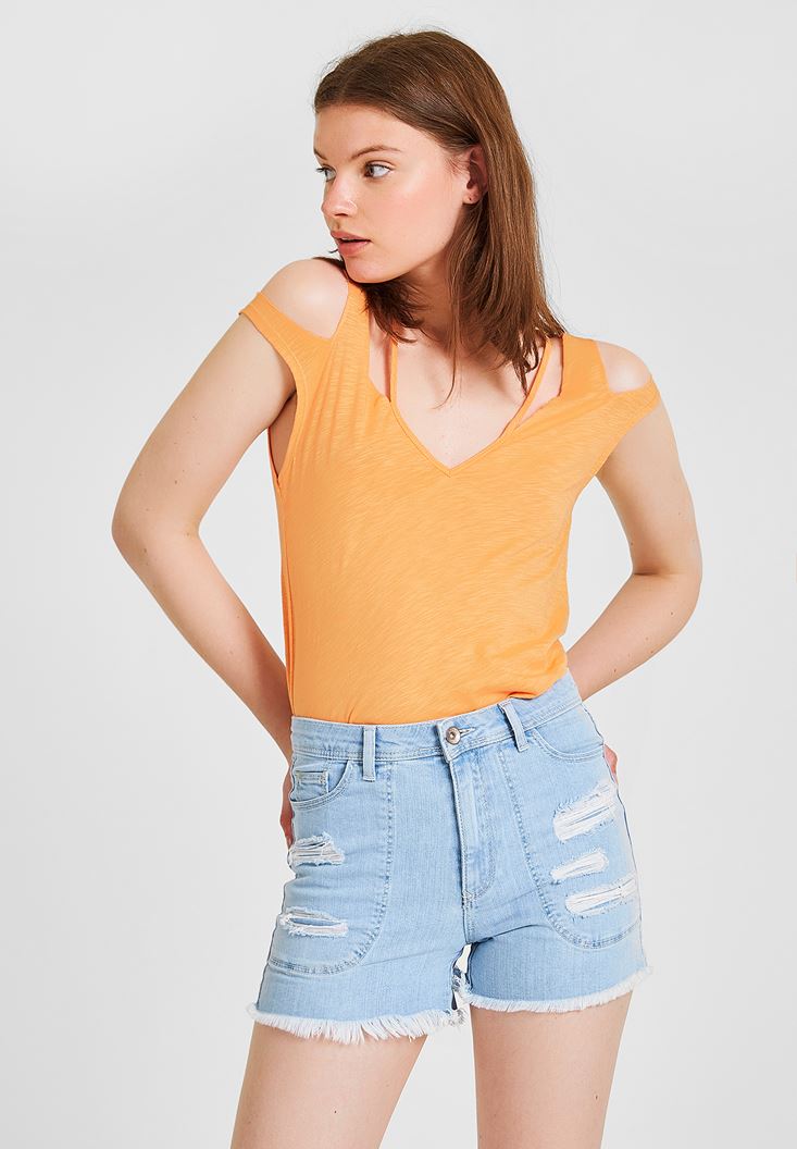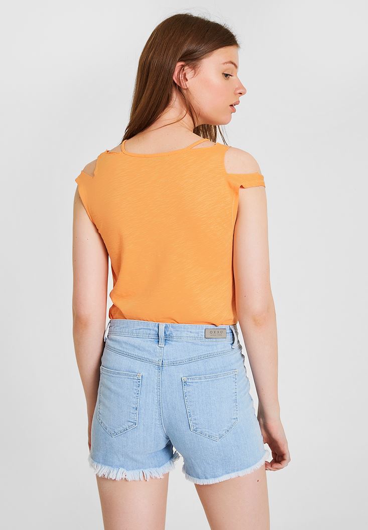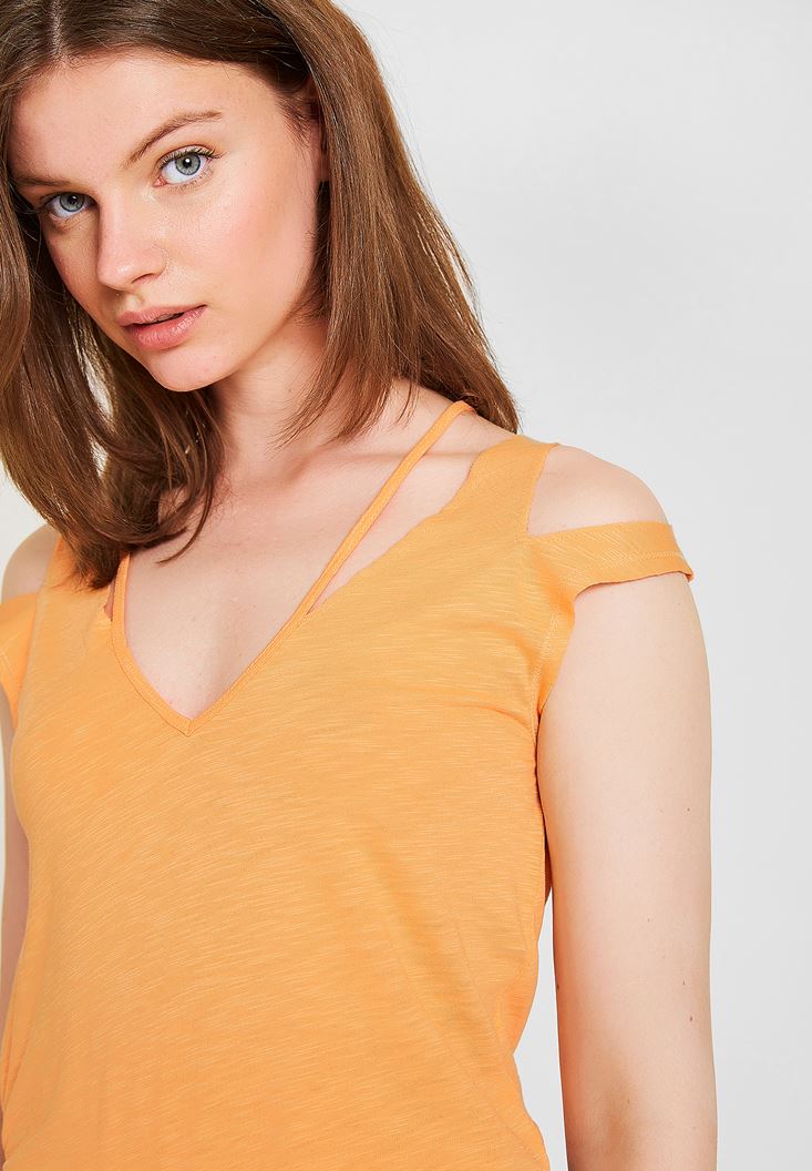 Turuncu Omuz Detaylı Biyeli Tişört