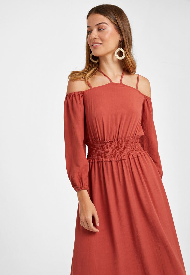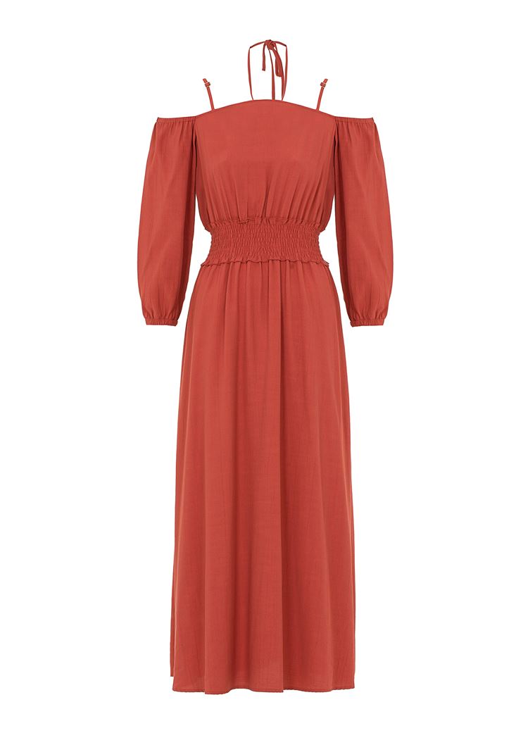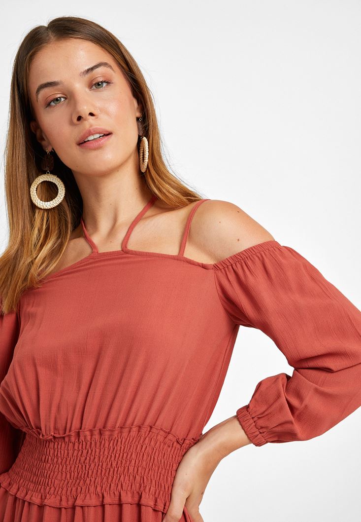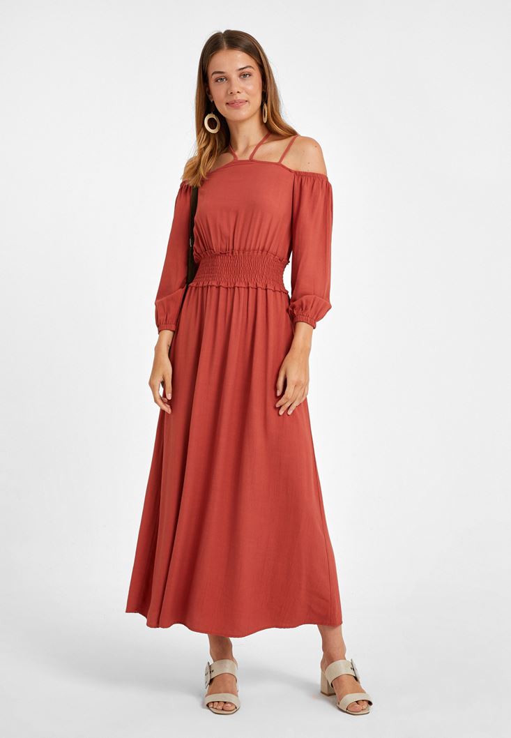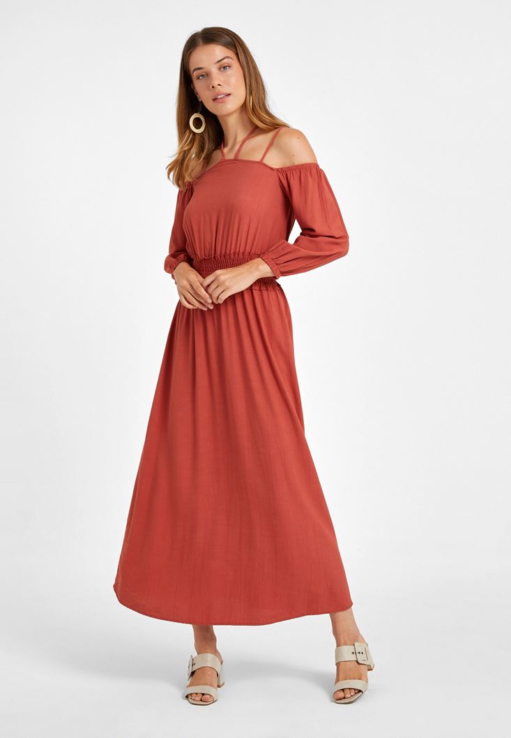 • Bayan Kiremit Omuz Detaylı Uzun Elbise
