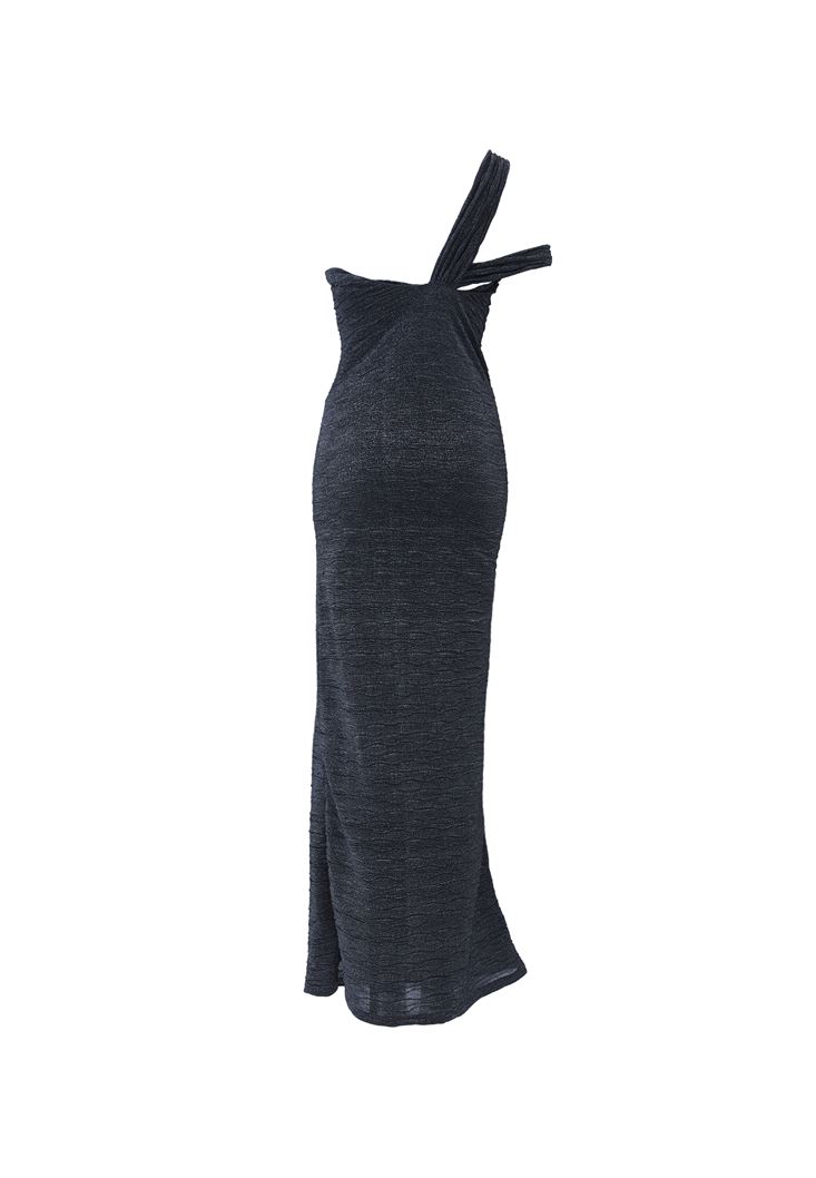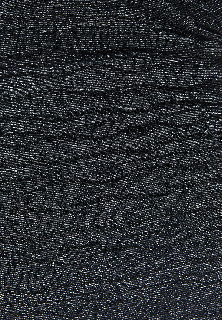 Viskon karışımlı parıltılı doku, bedene yakın fit, asimetrik yaka, burgulu tek omuz tasarım, yan beden kısımları büzgü detaylı, içi kısa astarlı.