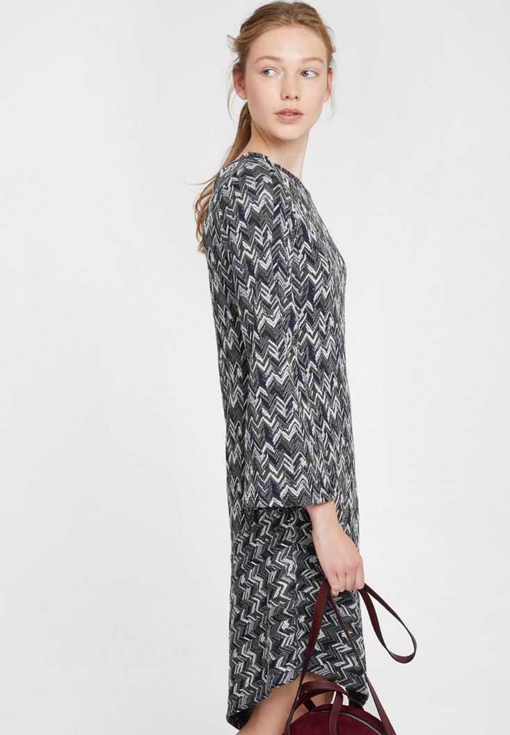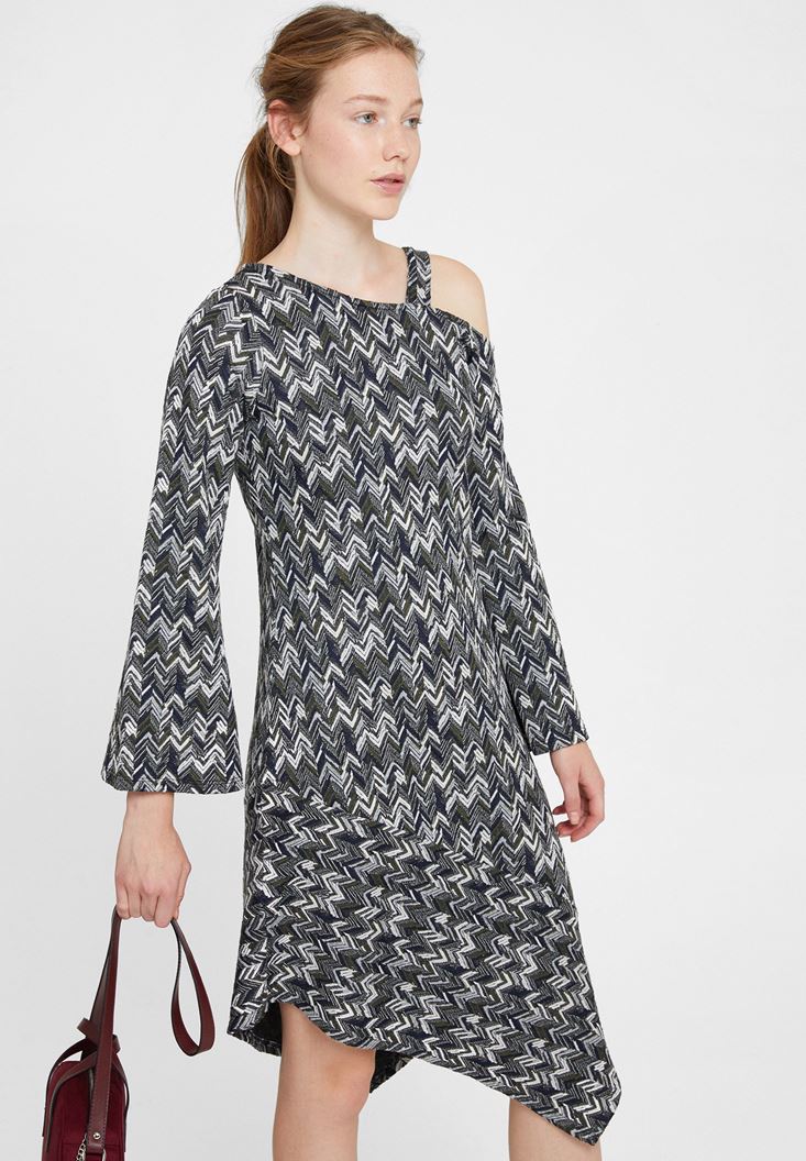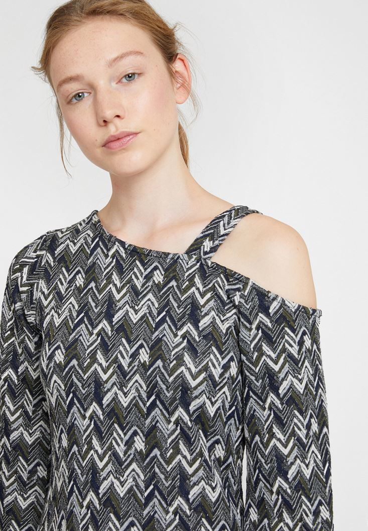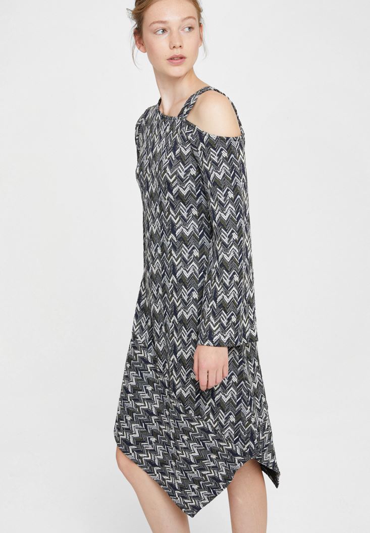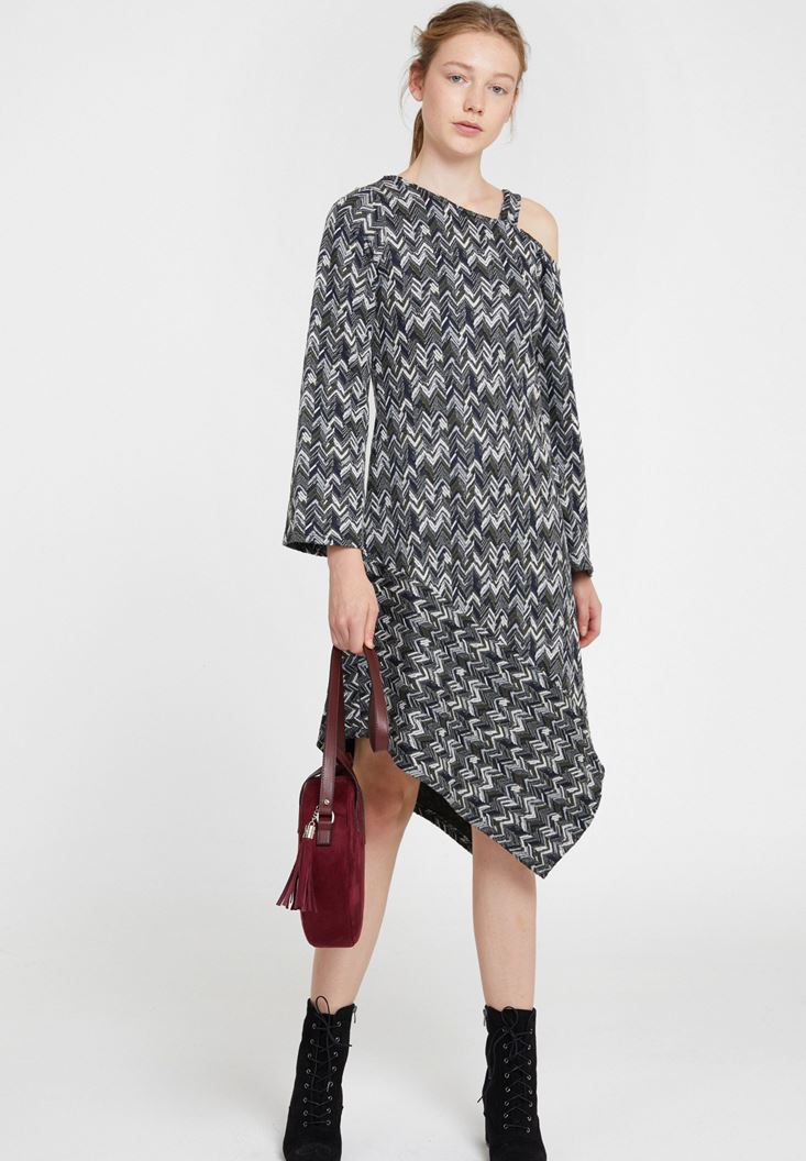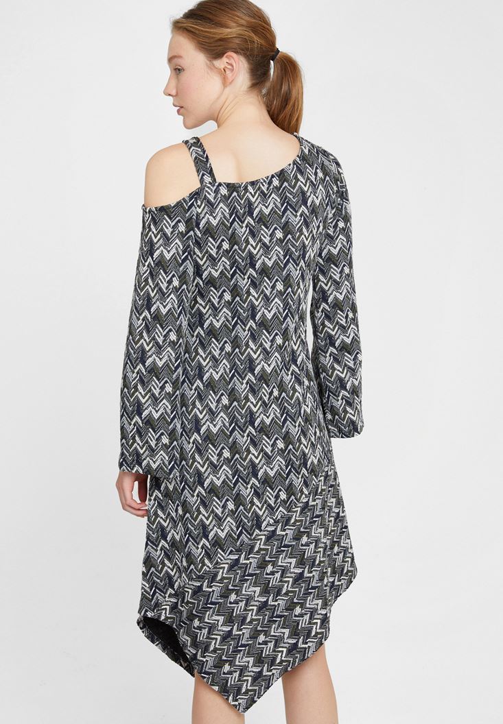 Omuz Detaylı Uzun Kollu Elbise modeli asimetrik kesim detayları ve zarif desenleri ile kendinizi her zaman konforlu ve şık hissetmenize yardımcı olacak elbise modelleri arasında yer alıyor. Düşük omuzlu kesimi ile zarif bir omuz dekoltesini ön plana çıkaran elbise modeli, tek omuz kesimini başarılı bir şekilde yansıtıyor. Elbise modelinin diz hizasından aşağıya doğru devam eden asimetrik etek kesimi de tasarıma başarılı bir şekilde hareket kazandırıyor. Elbise modelinin üzerinde kullanılan zikzak desenleri ve bilek hizasında biten kol boyu tasarımın. Zarafetini yansıtan detaylar olarak dikkat çekiyor. OXXO’nun özgür ruhunu yansıtan elbise modelleri arasında öne çıkan tasarım ile şıklığınızı konfor ile buluşturmanın tadını çıkaracaksınız.