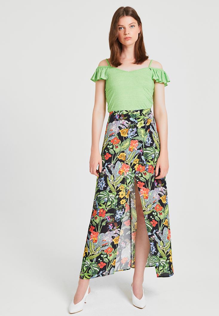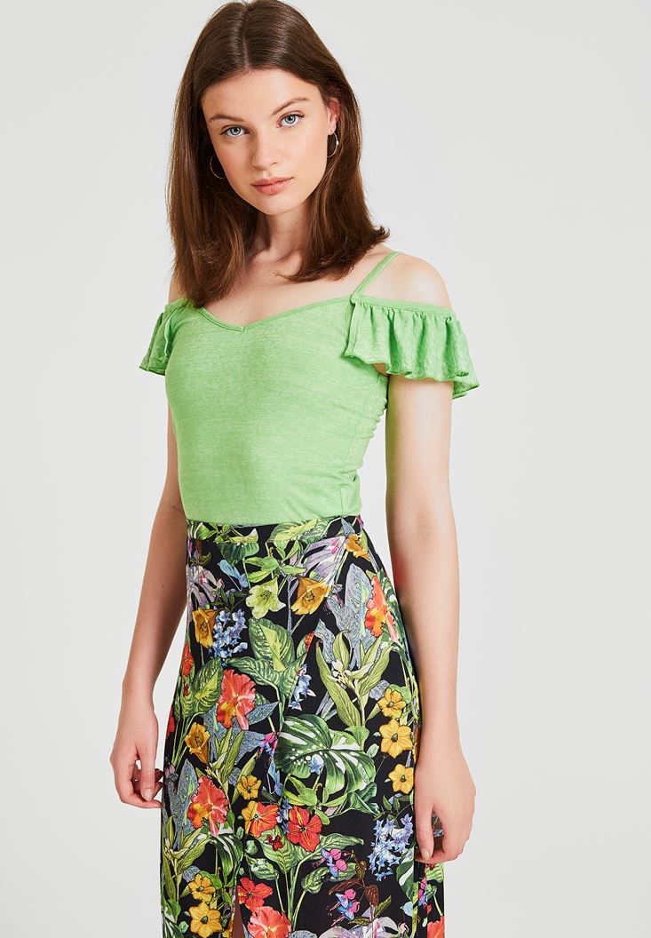 • Bayan Yeşil Omuzları Fırfırlı İnce Askılı Bluz