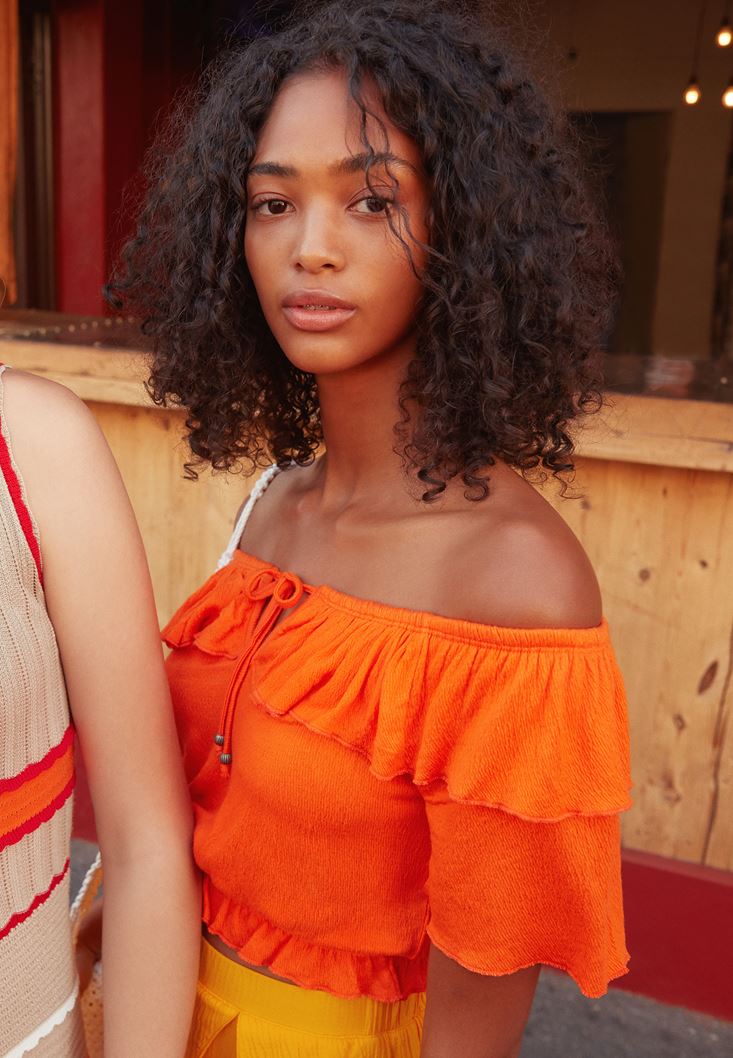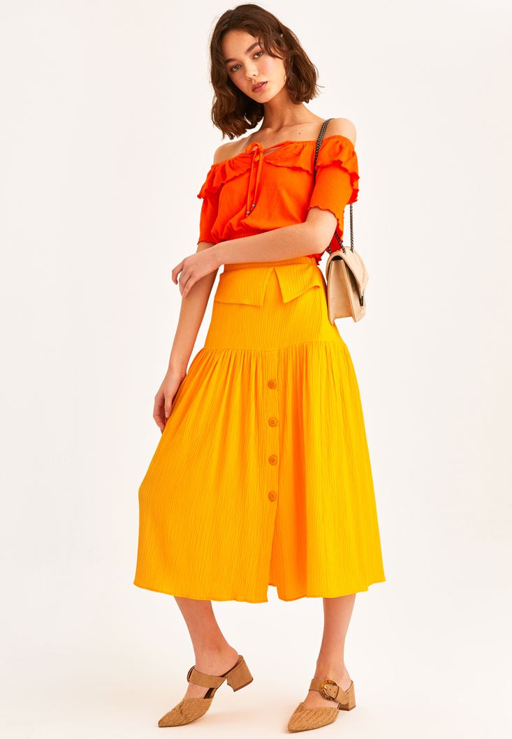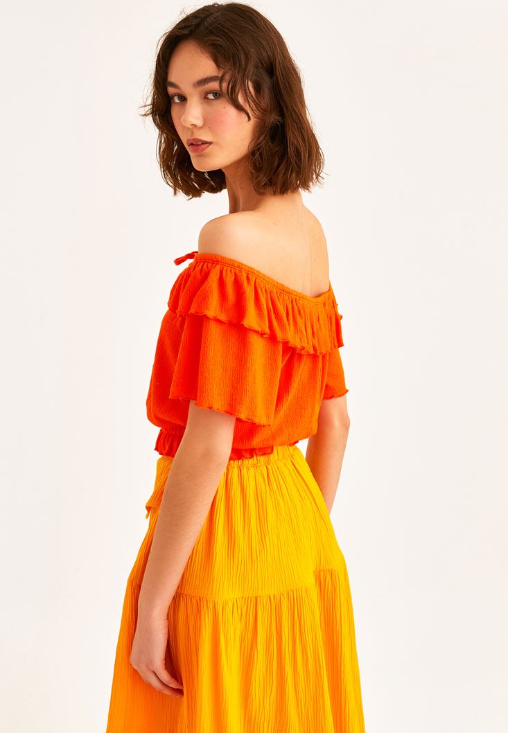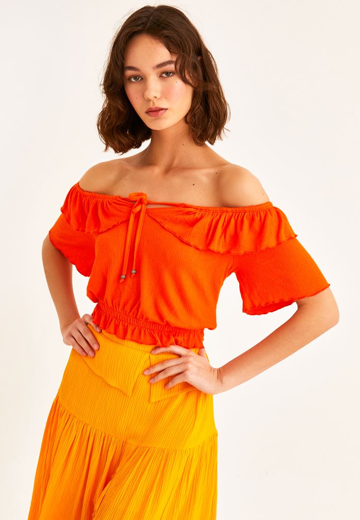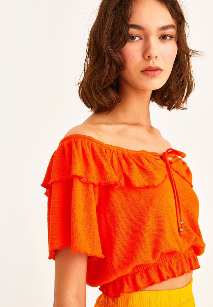 • Bayan Turuncu Omzu Açık Crop Bluz