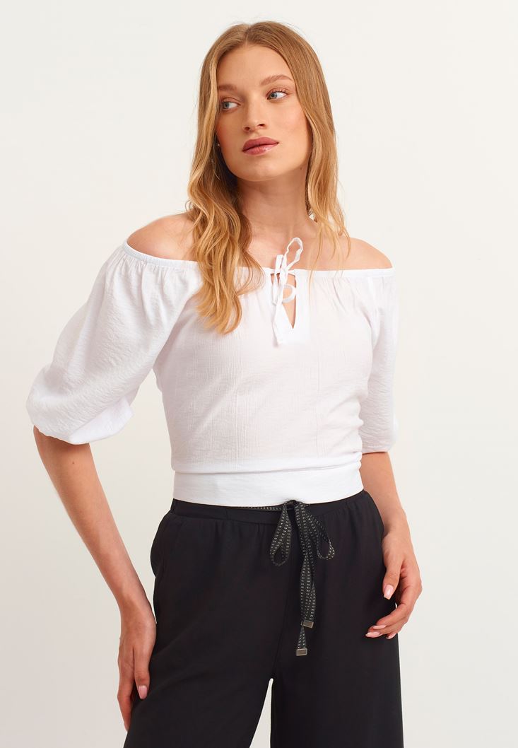 • Bayan Beyaz Omzu Açık Crop Bluz