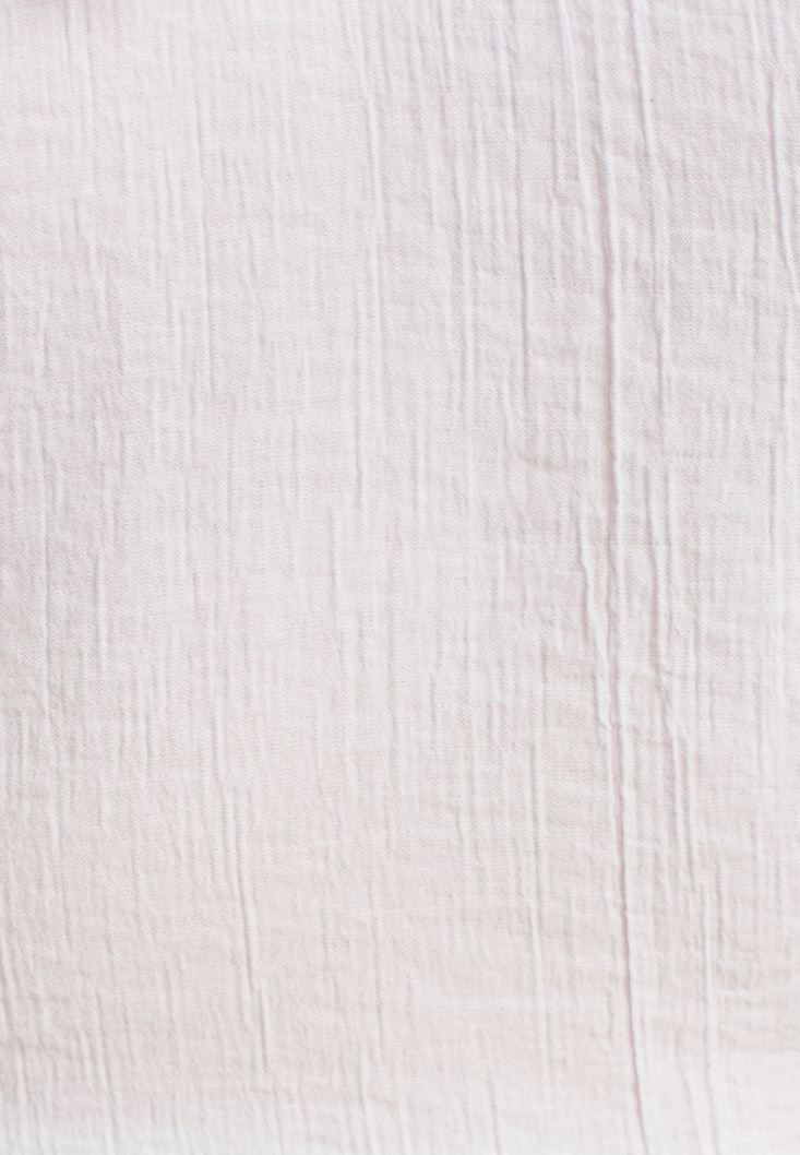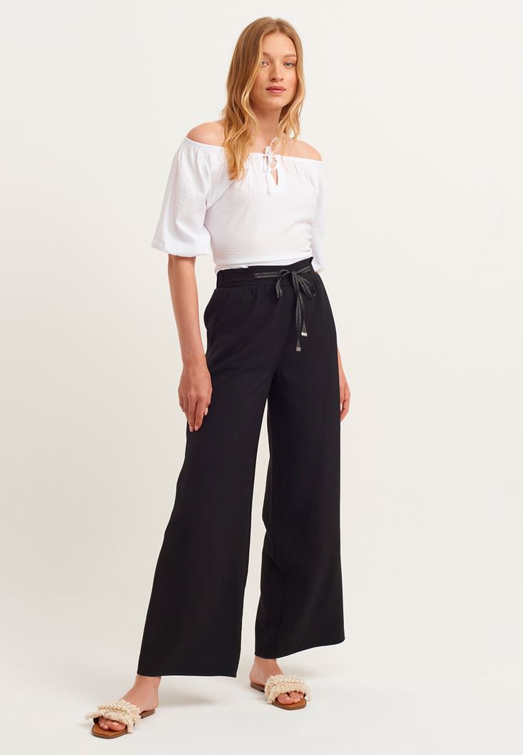 Viskon karışımlı özel doku, düşük omuz formu, yakası bağcıklı ve lastikli, arka bel kısmı ve kol ucu lastikli, crop kesim.