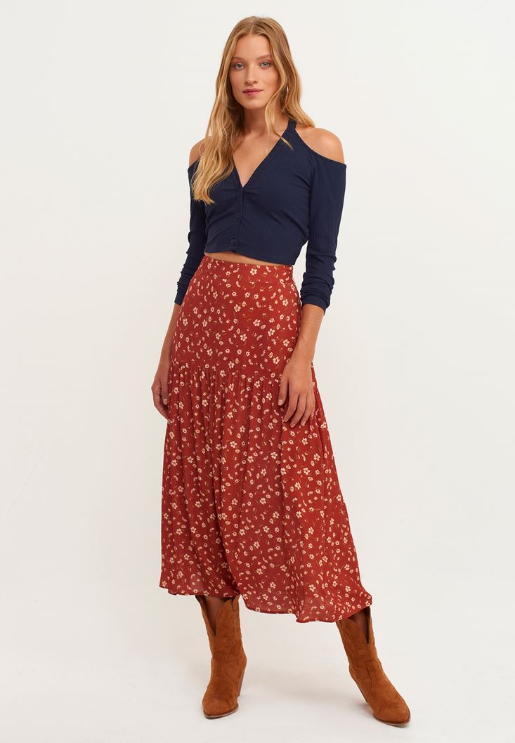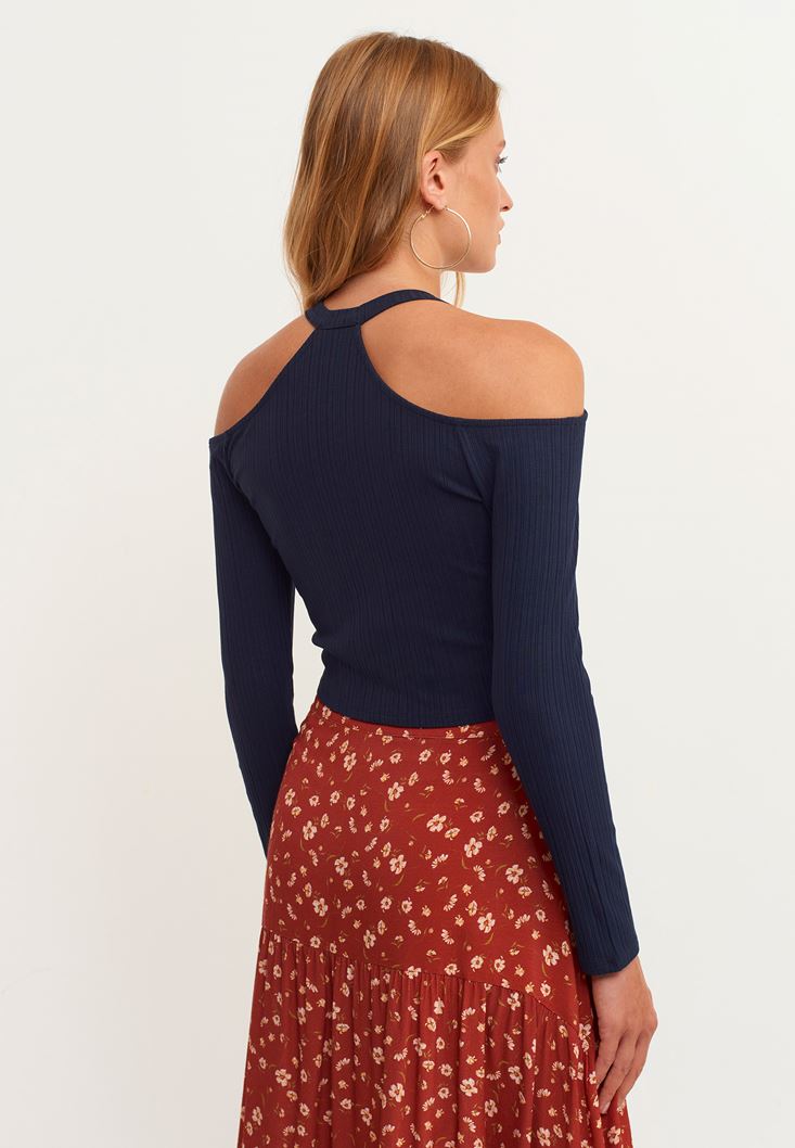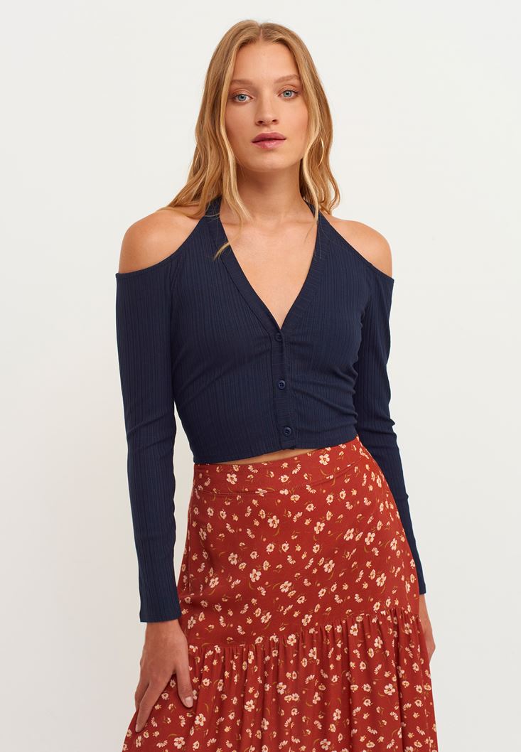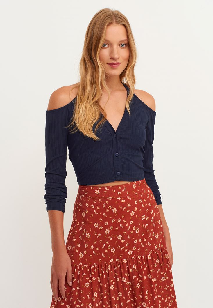 Viskon karışımlı, cut-out detaylı omuz tasarımı, crop kesim, düğmeli, bedeni saran rahat kalıp, uzun kollu.