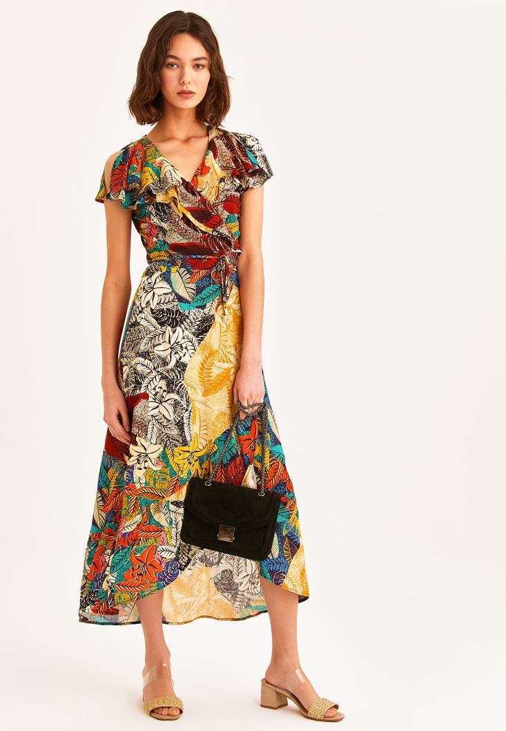 • Bayan Çok Renkli Omzu Kesik Detaylı Uzun Elbise