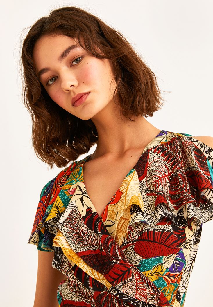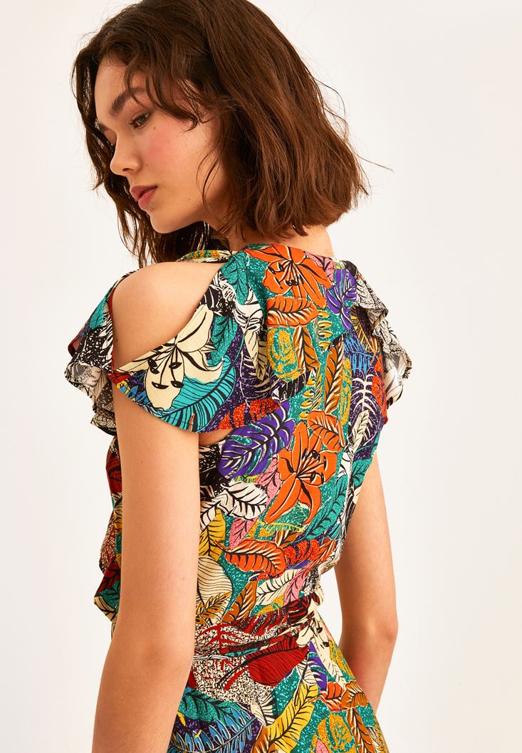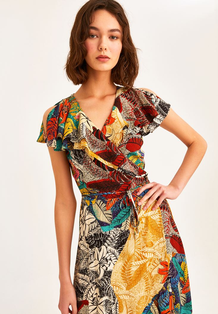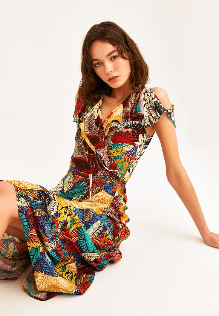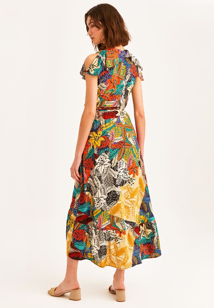 Çok Renkli Omzu Kesik Detaylı Uzun Elbise