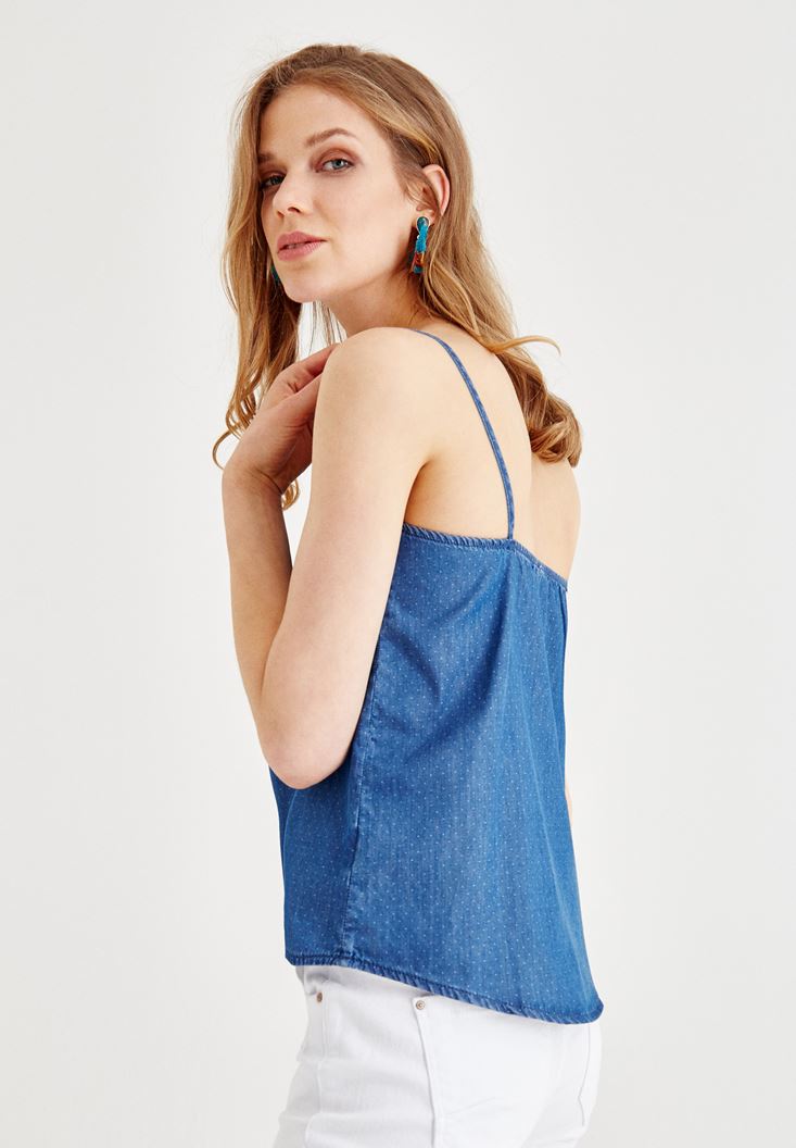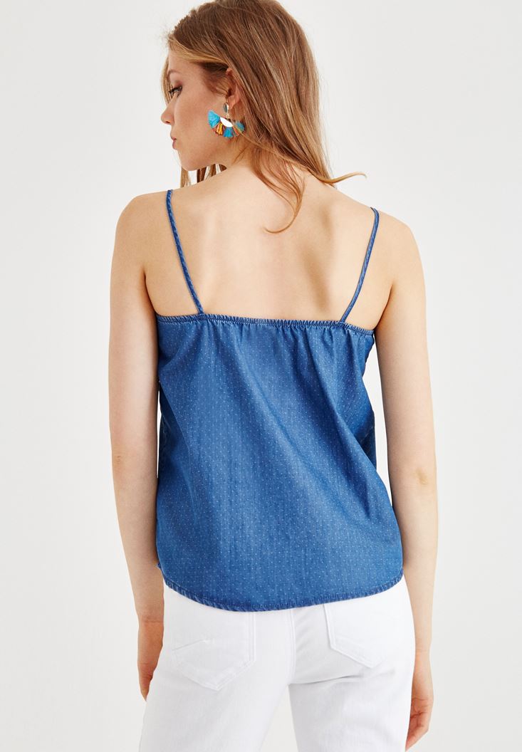 Mavi Önü Bağlama Detaylı Askılı Jean Bluz