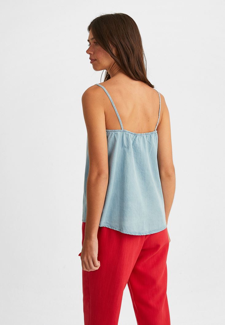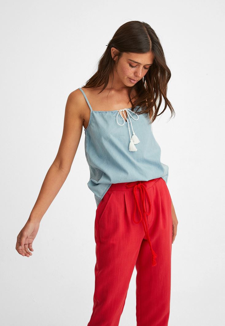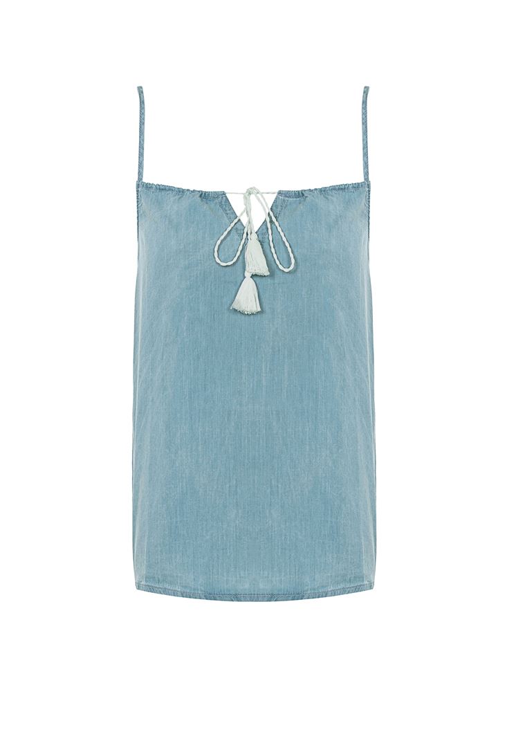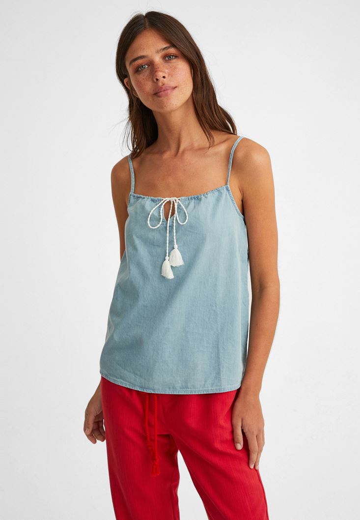 Önü Bağlama Askılı Jean Bluz modeli yazın favori parçaları arasında olacak şık askılı modellerinden birisi. %100 Pamuk içeriği olan askılı bluz modeli özellikle yaz aylarında terin buharlaşarak havaya karışmasını sağlar ve gün boyu konforlu hissetmenize yarcımcı olur. Pürüzsüz dokusu ve tasarımda bulunan önden bağlama detayı ile spor şıklık sunan jean bluz modeli yaz aylarında vazgeçemeyeceğiniz askılı bluz modelleri arasında. OXXO'nun sadeliğini konfor ve şıklık ile bir araya getiren askılı jean bluz modeli ile hissedeceğiniz rahatlığı çok seveceksiniz.