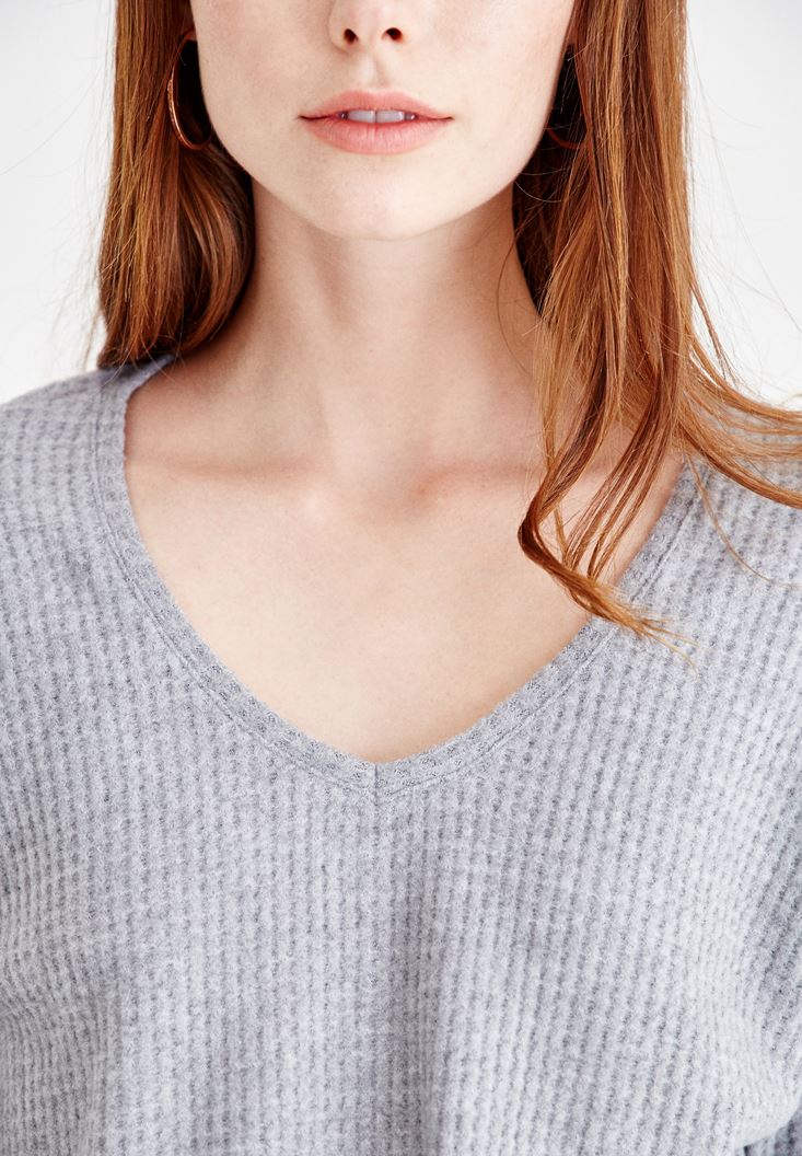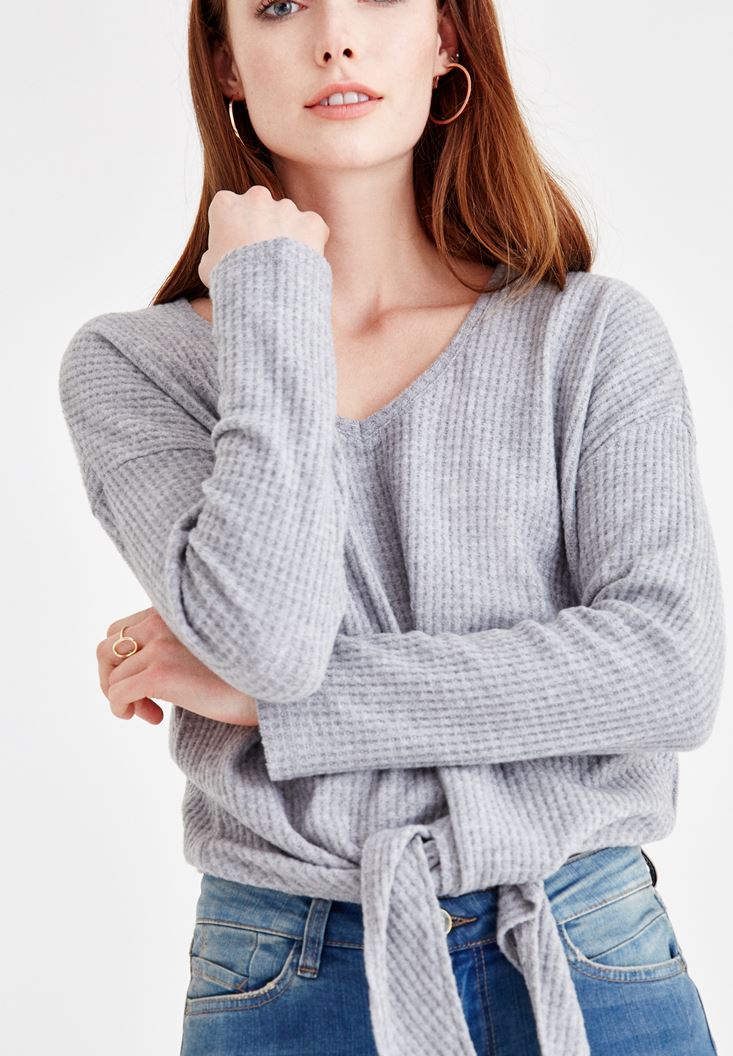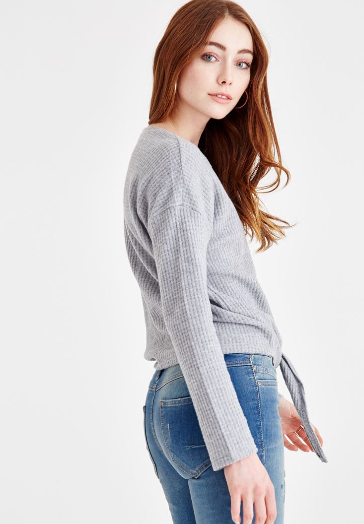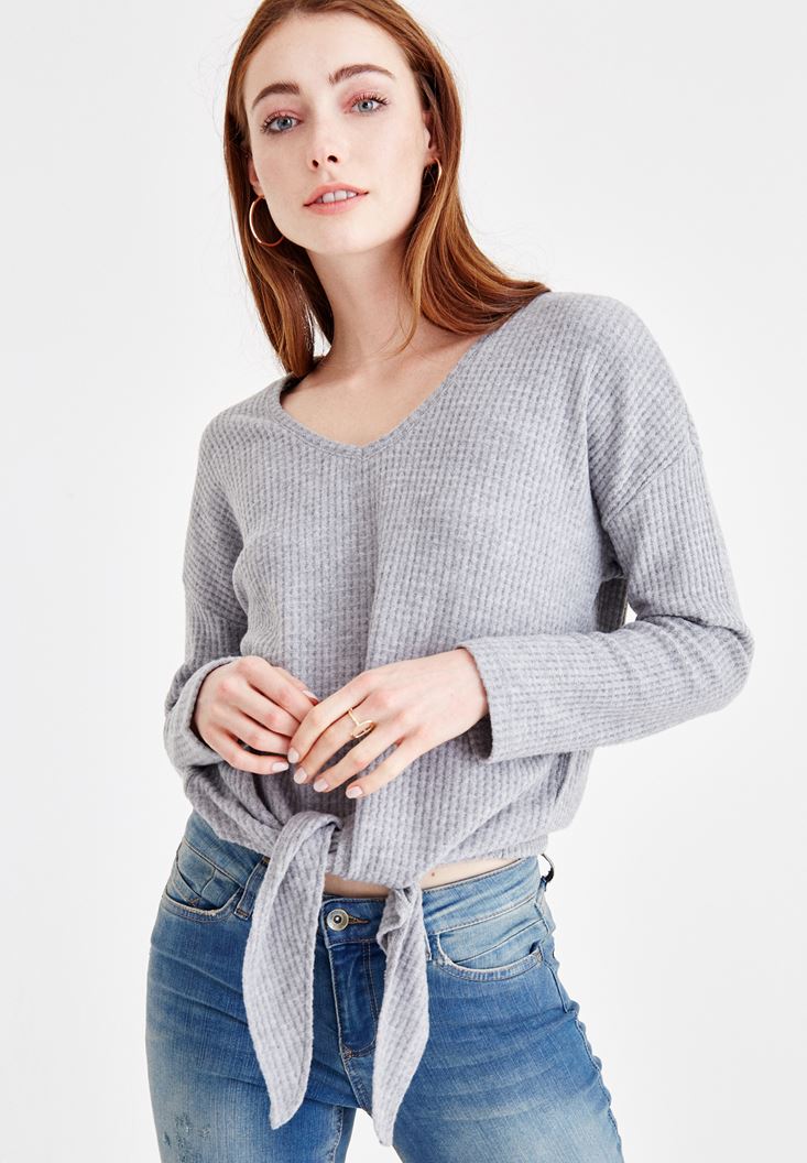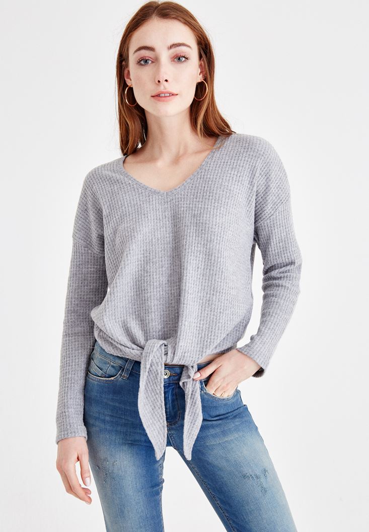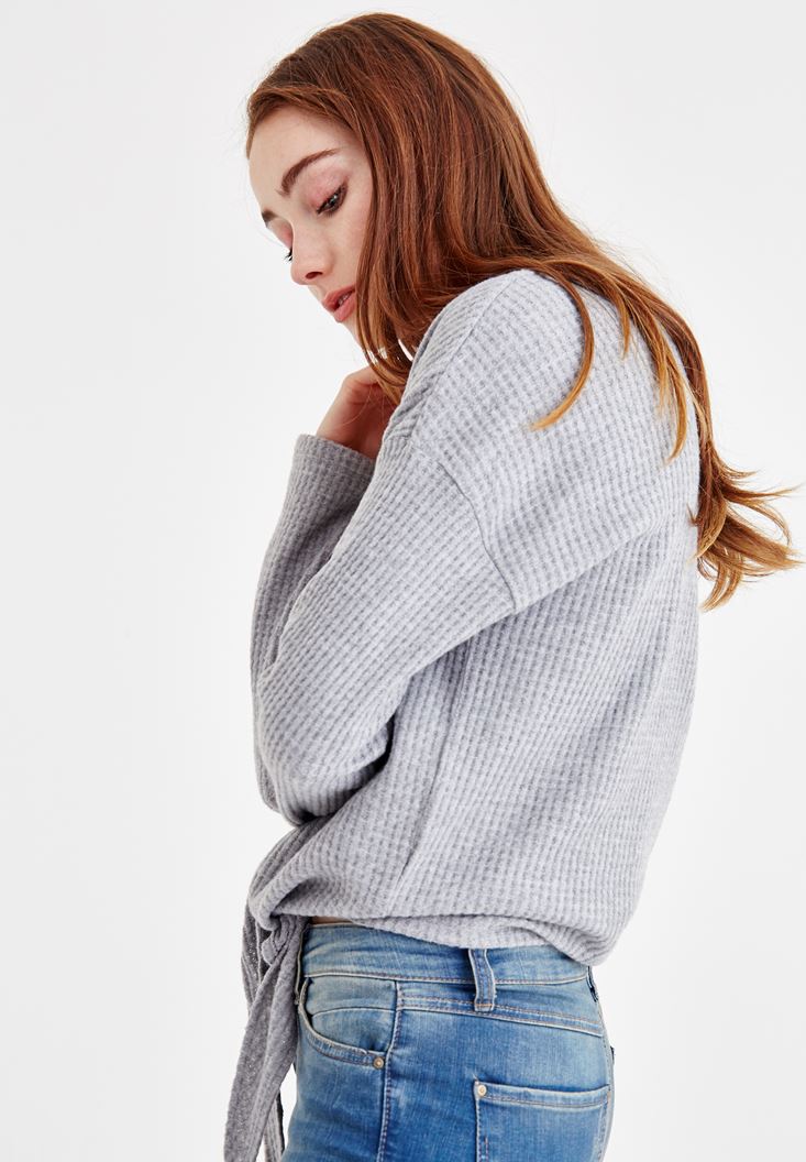 • Bayan Gri Önü Bağlama Detaylı V Yaka Triko