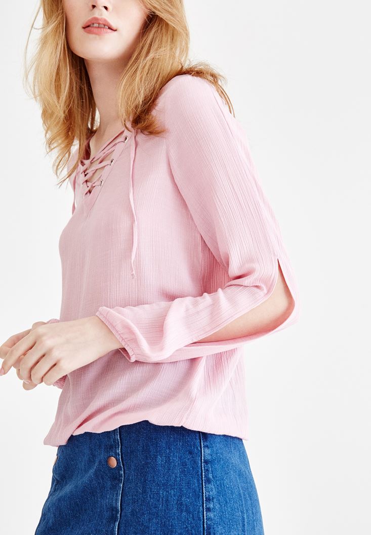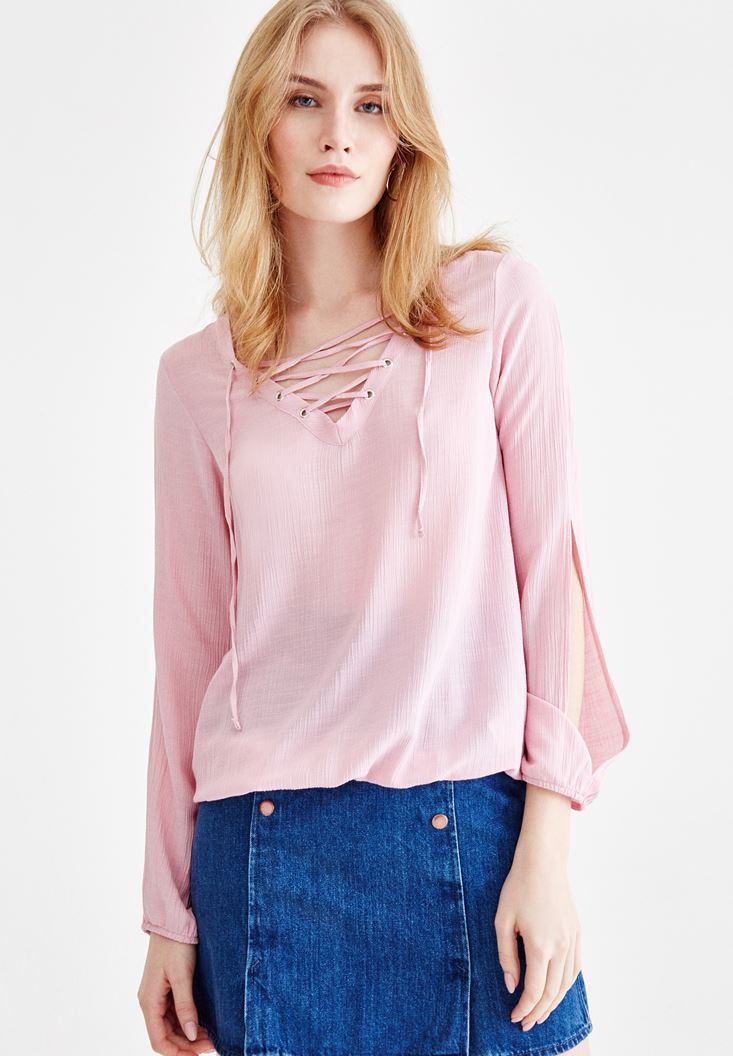 • Bayan Pembe Önü Bağlamalı Kol Detaylı Bluz