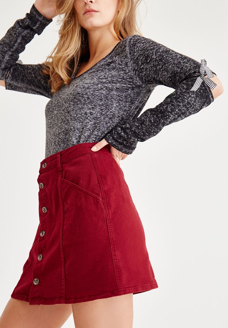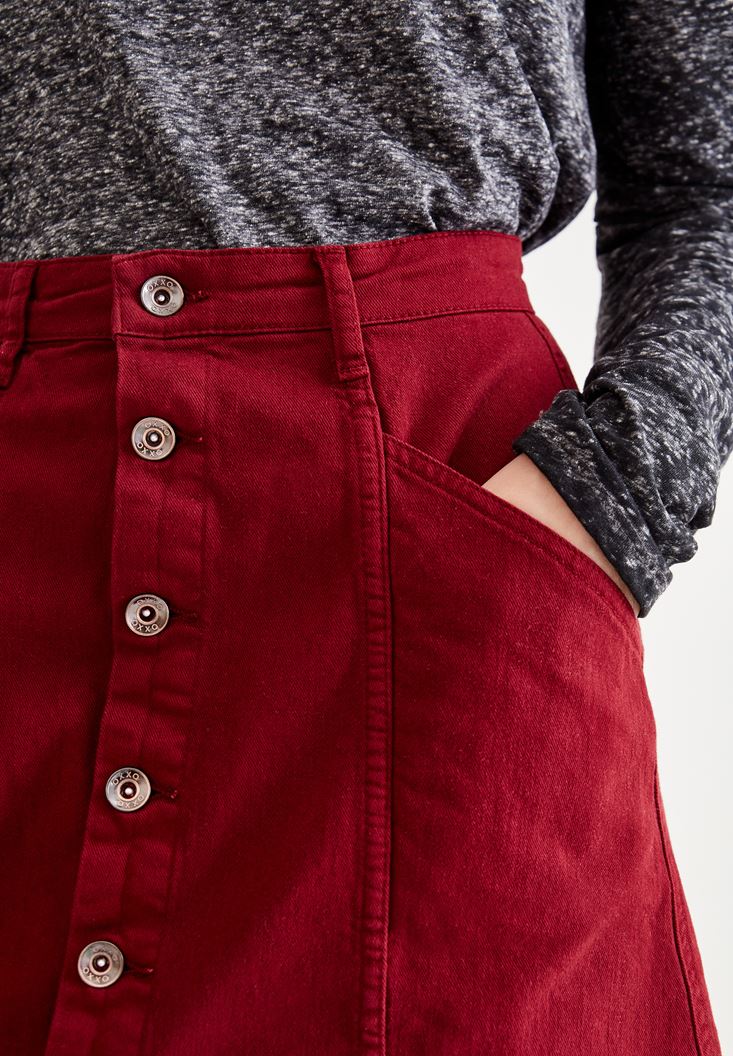 Bordo Önü Düğmeli Cep Detaylı Etek