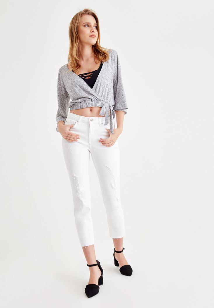 • Bayan Gri Önü Kruvaze Beli Lastik Detaylı Bluz
