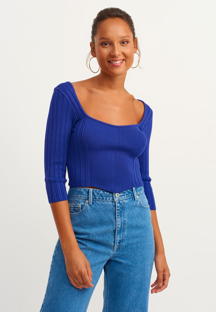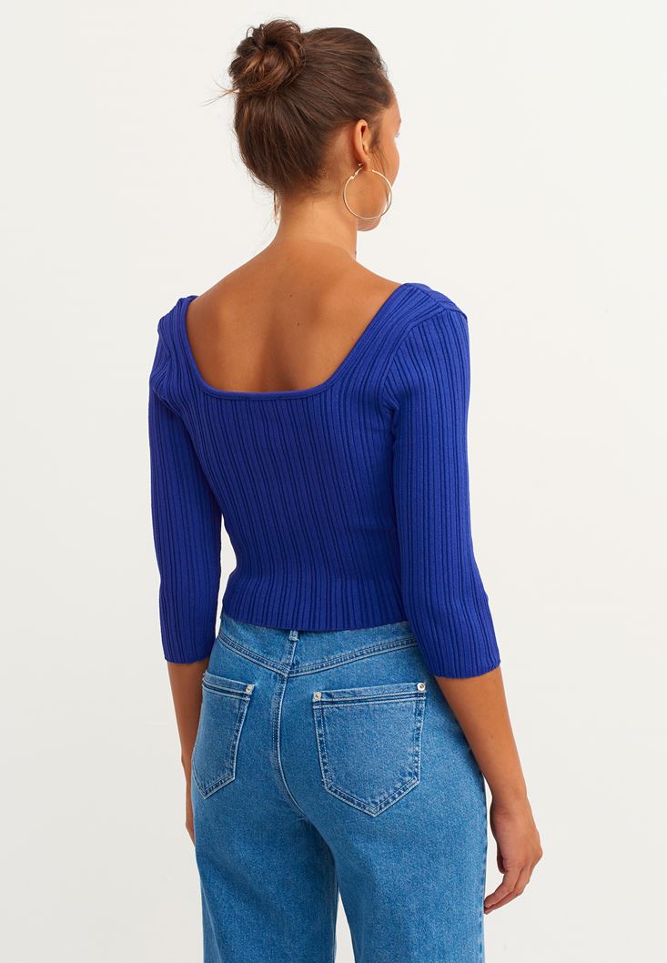• Bayan Mavi Örgü Detaylı Crop Triko