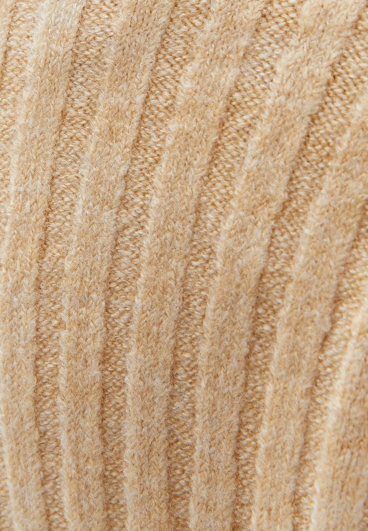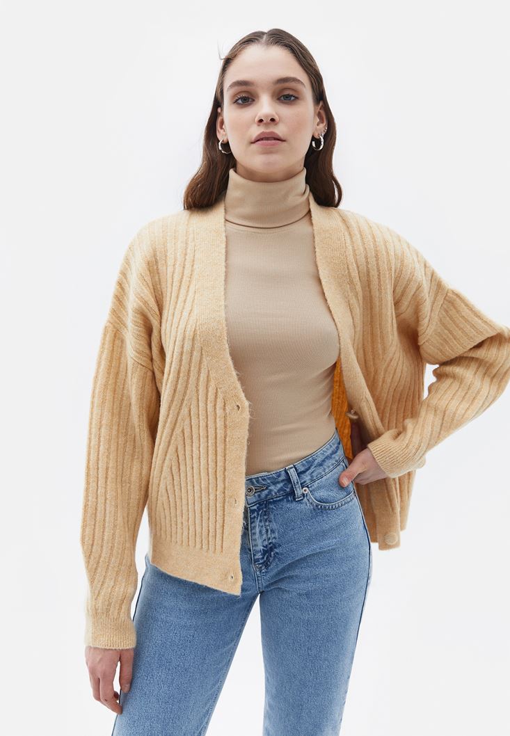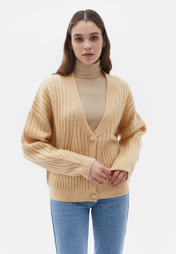 Yumuşak özel triko doku, V yaka, düğme kapamalı, bedene yakın fit, uzun kollu, geniş fitilli örgü, standart boy.