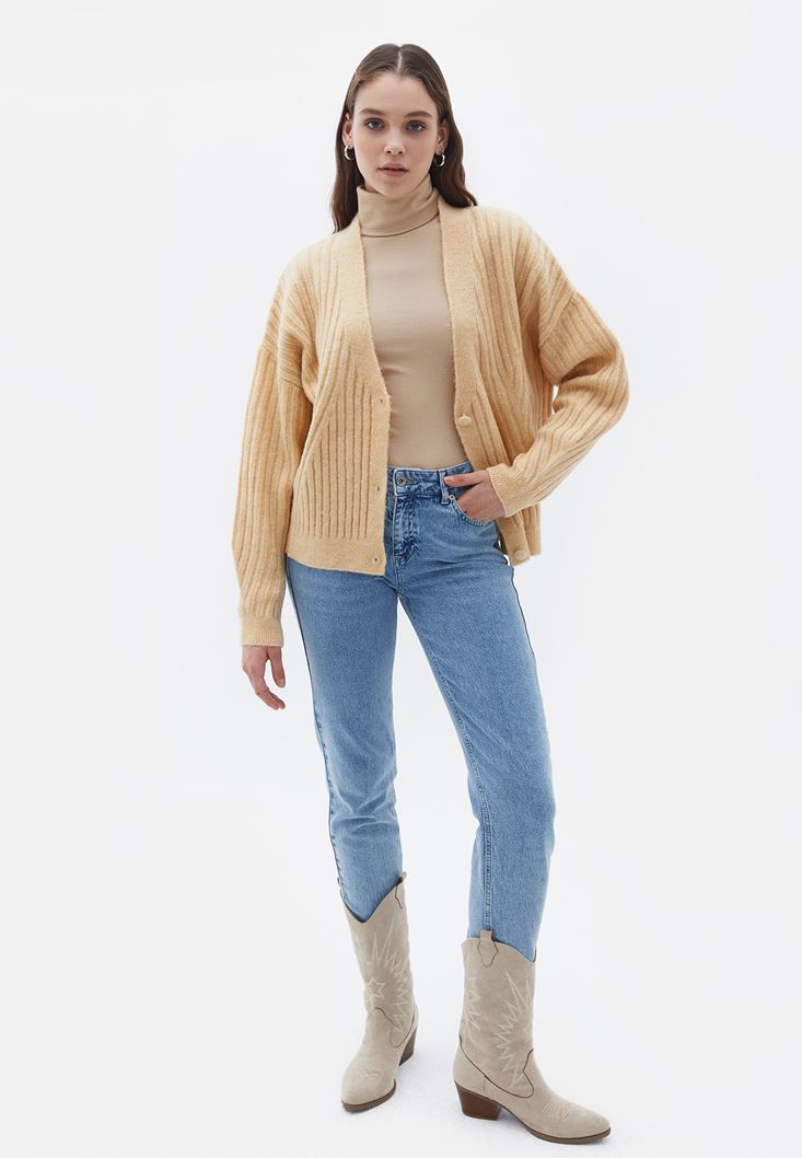 Krem Örgü Detaylı Düğmeli Triko Hırka