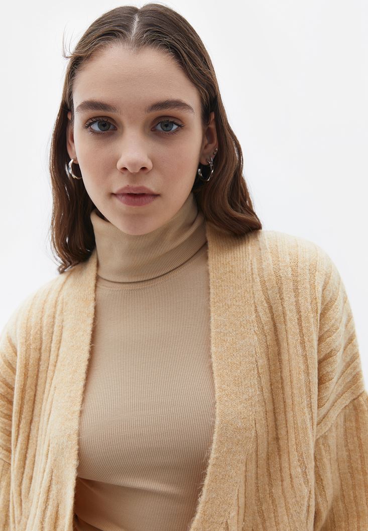 • Bayan Krem Örgü Detaylı Düğmeli Triko Hırka