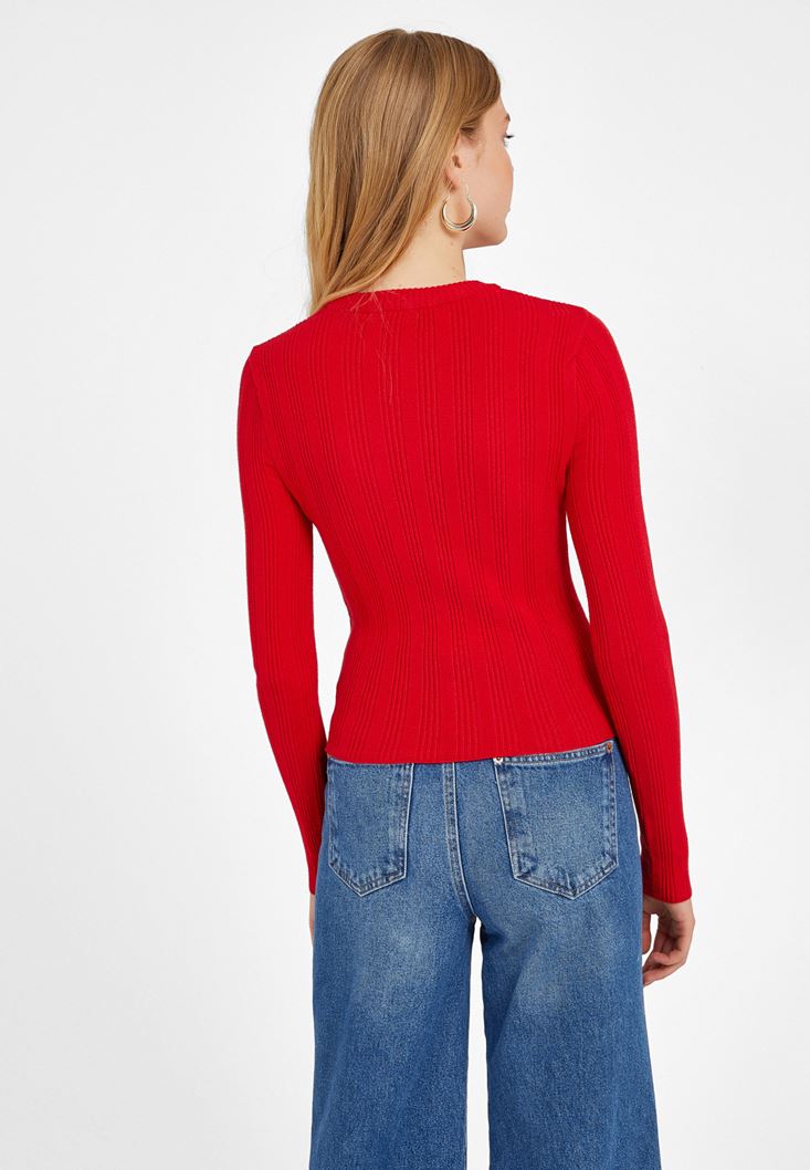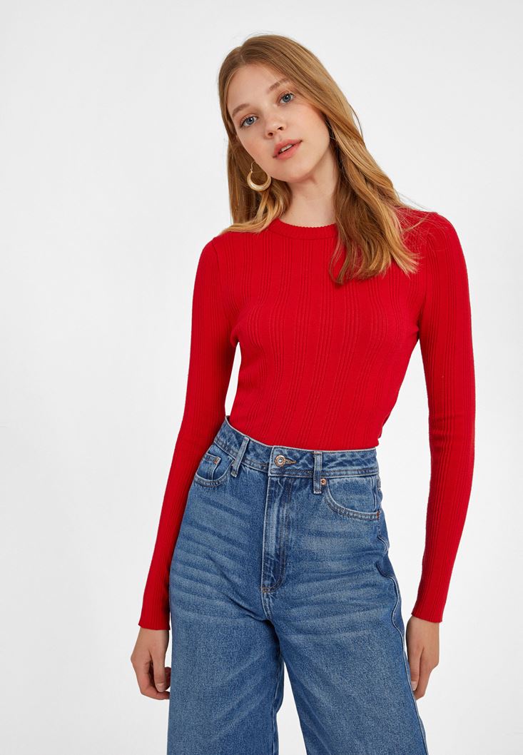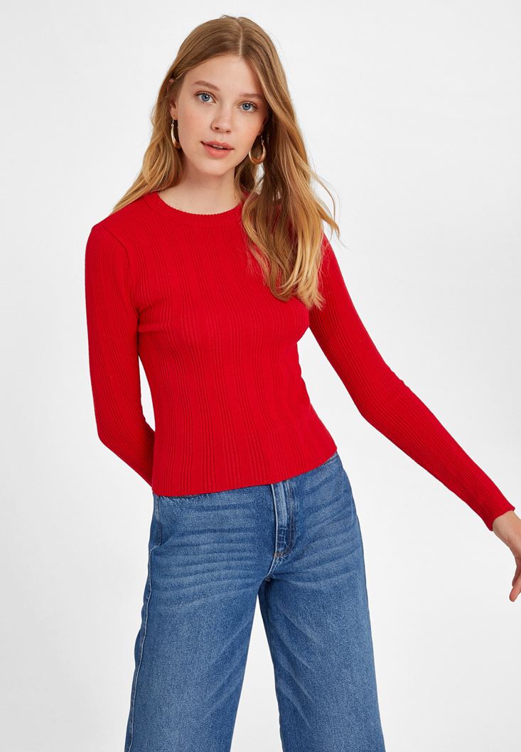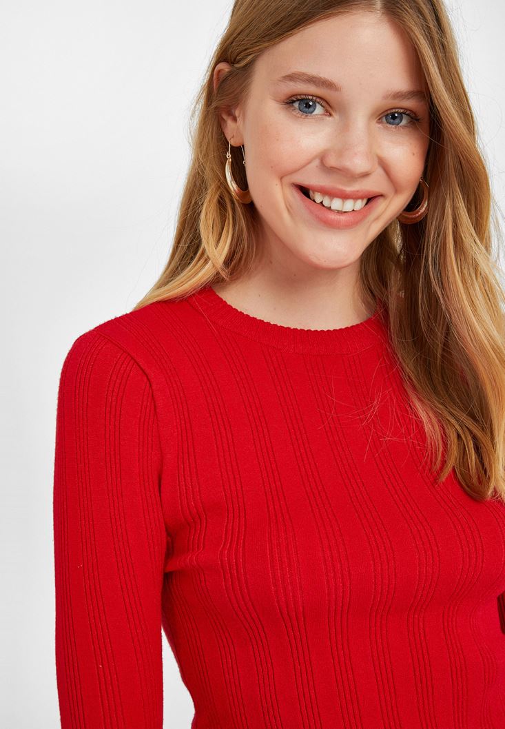 • Bayan Kırmızı Örgü Detaylı Kısa Kazak