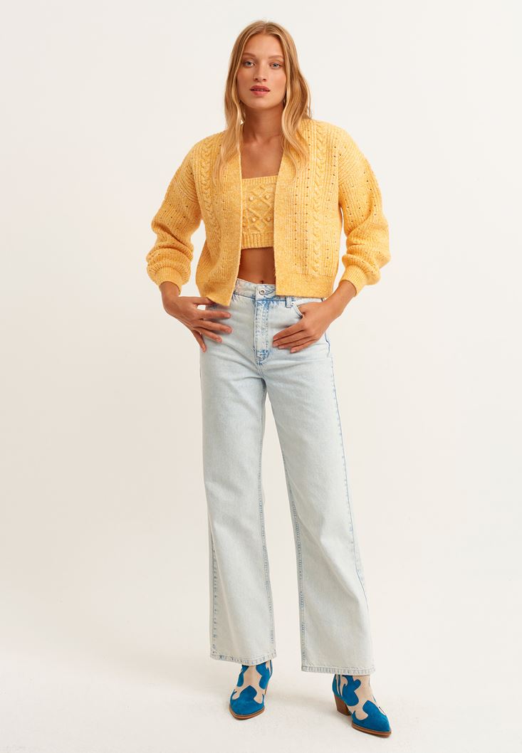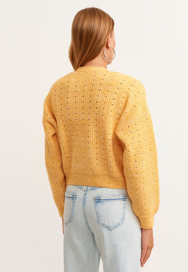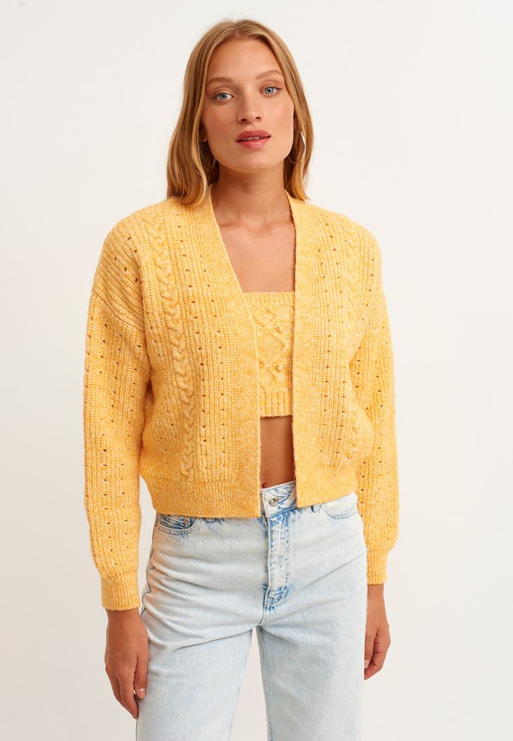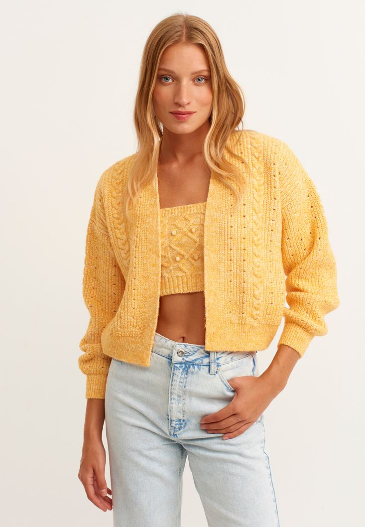 • Bayan Sarı Örgü Detaylı Triko Hırka