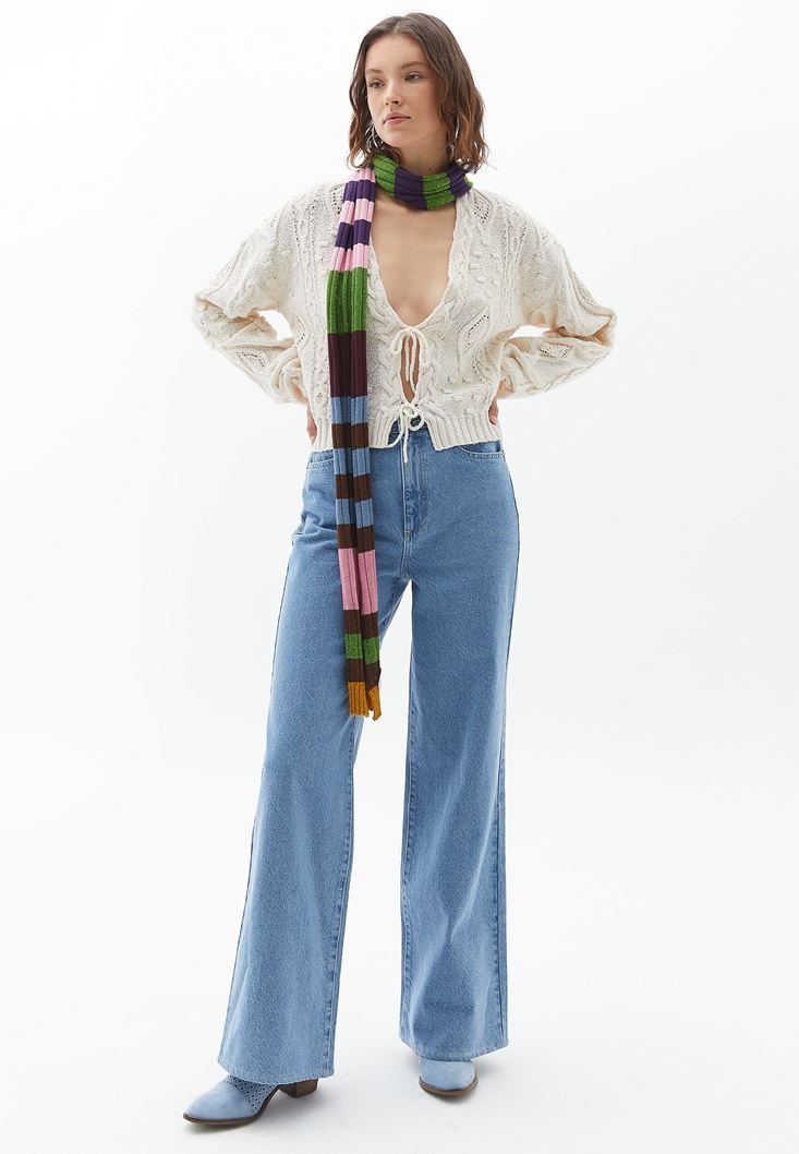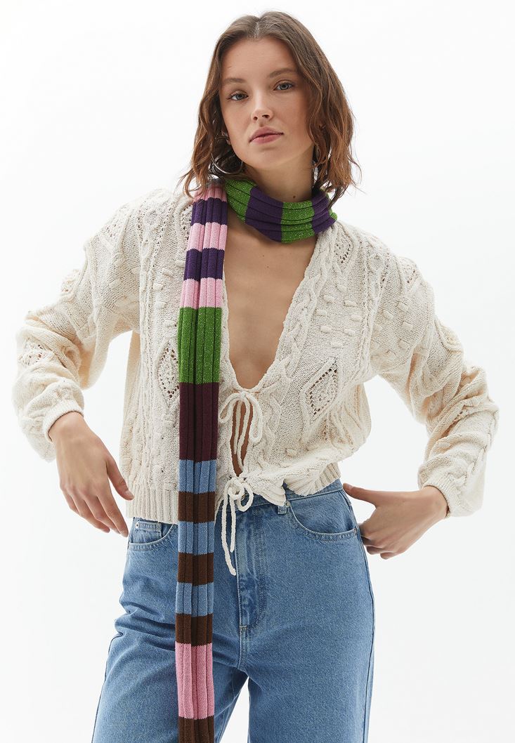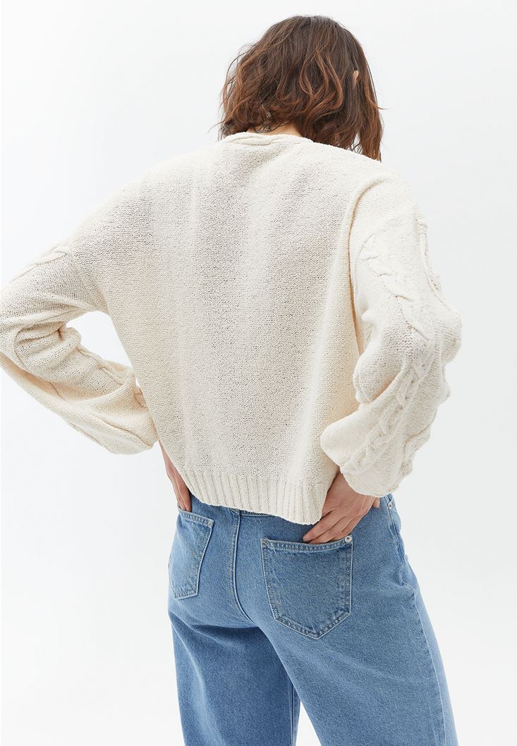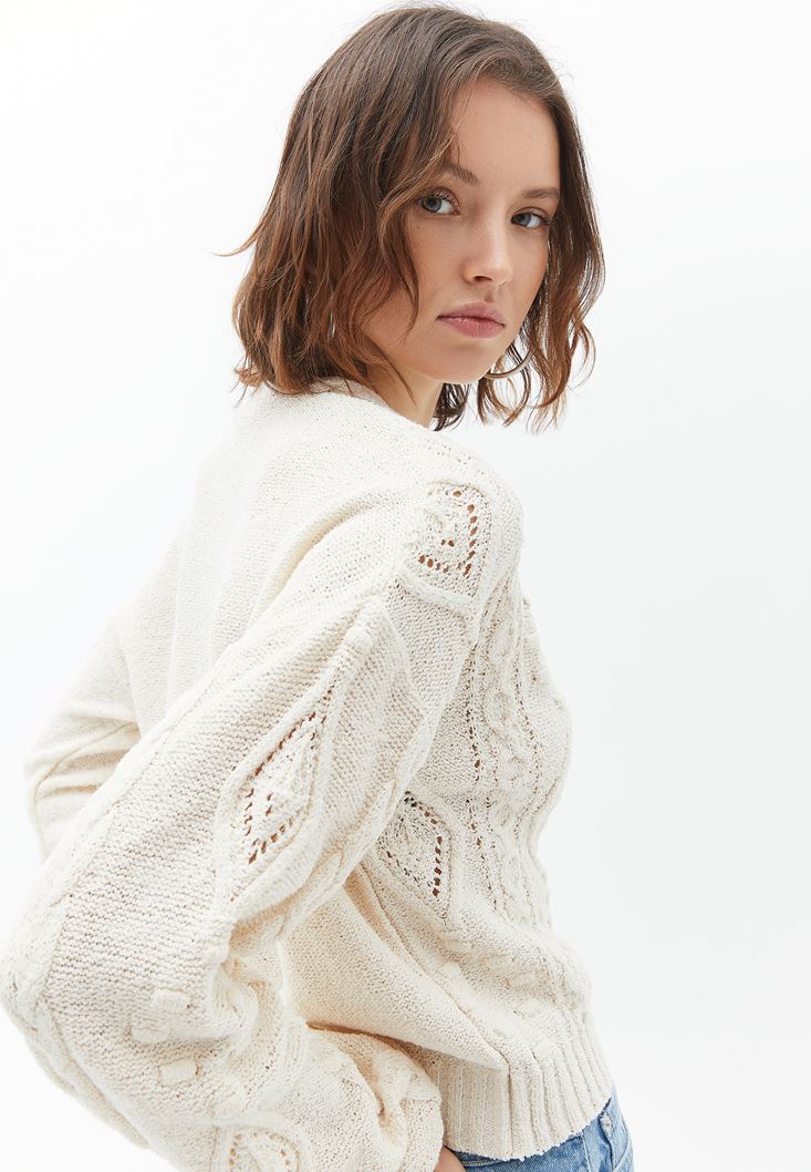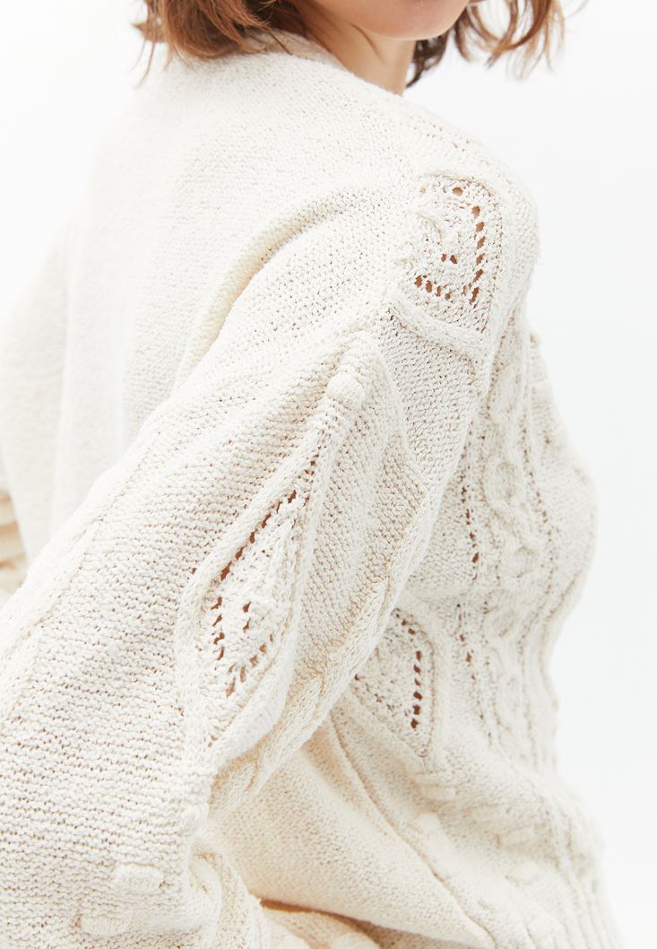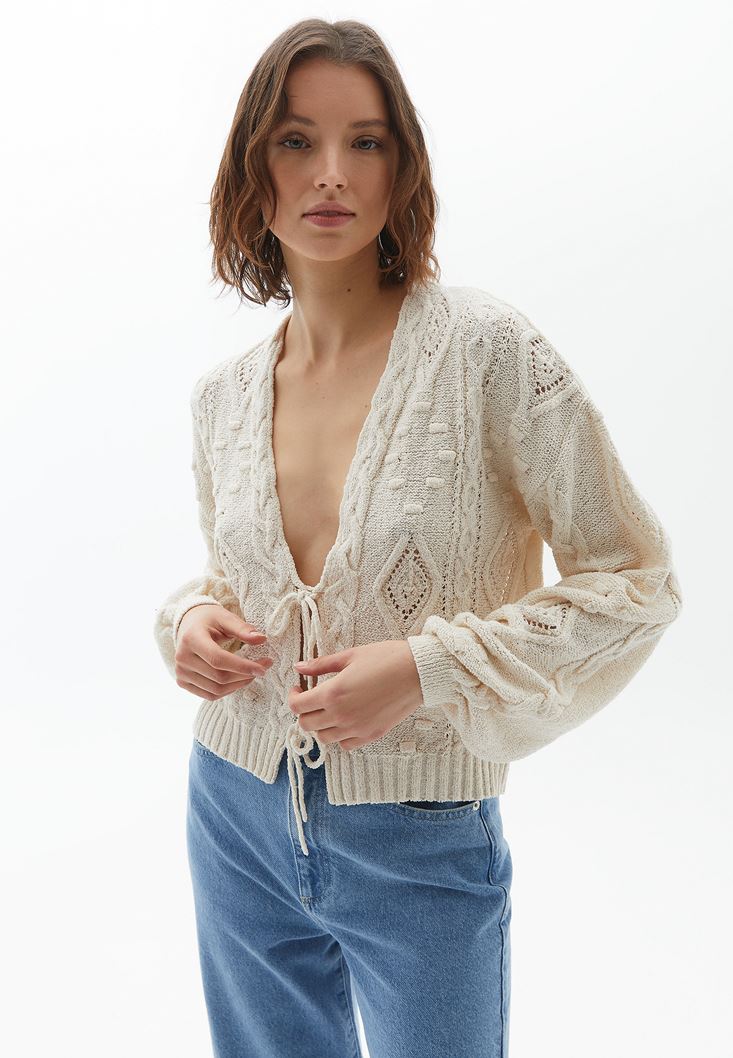 Krem Örgü Detaylı Triko Hırka