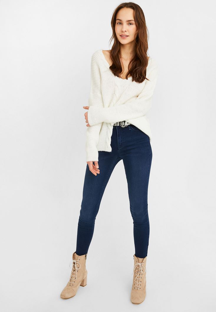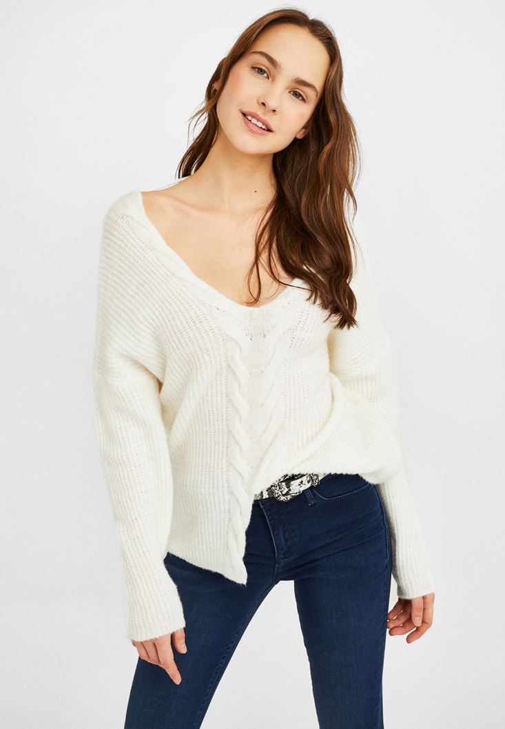 Örgü Detaylı Triko Kazak modeli asimetrik detayları, dökümlü kesimi ve yumuşak dokusu ile kombinlerinizde yer vermekten keyif alacağınız triko kazak modelleri arasında yer alıyor. Geniş V yaka kesimi ve bu kesimle simetri oluşturan sırt dekoltesi ile oldukça hareketli bir görünüm kazanan kadın triko kazak modelini dilerseniz bralet, büstiyer gibi parçalarla kombinleyebilir, dilerseniz bir elbisenin üzerine alarak salaş bir görünüm elde edebilirsiniz. Tasarımın ön kısmında bulunan örgü detayı klasik bir görünüm sunarken aynı zamanda örgü detayında kullanılan kesik tasarıma hoş bir enerji kazandırıyor. OXXO’nun enerjisi yüksek, özgür ruhlu kadınlardan aldığı ilhamı yansıtan kazak modelleri arasında yer alan tasarım ile özgün, şık, salaş kombinler yapabilirsiniz.
