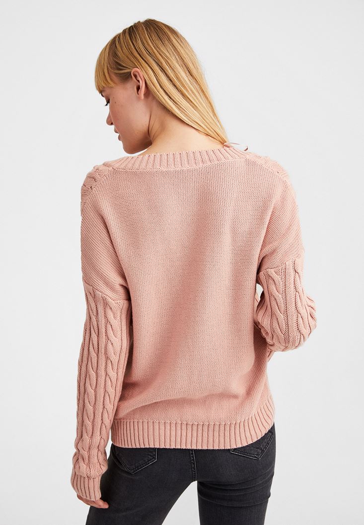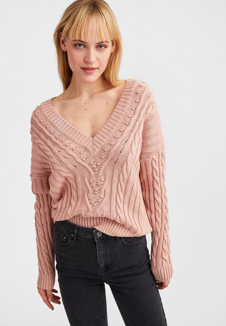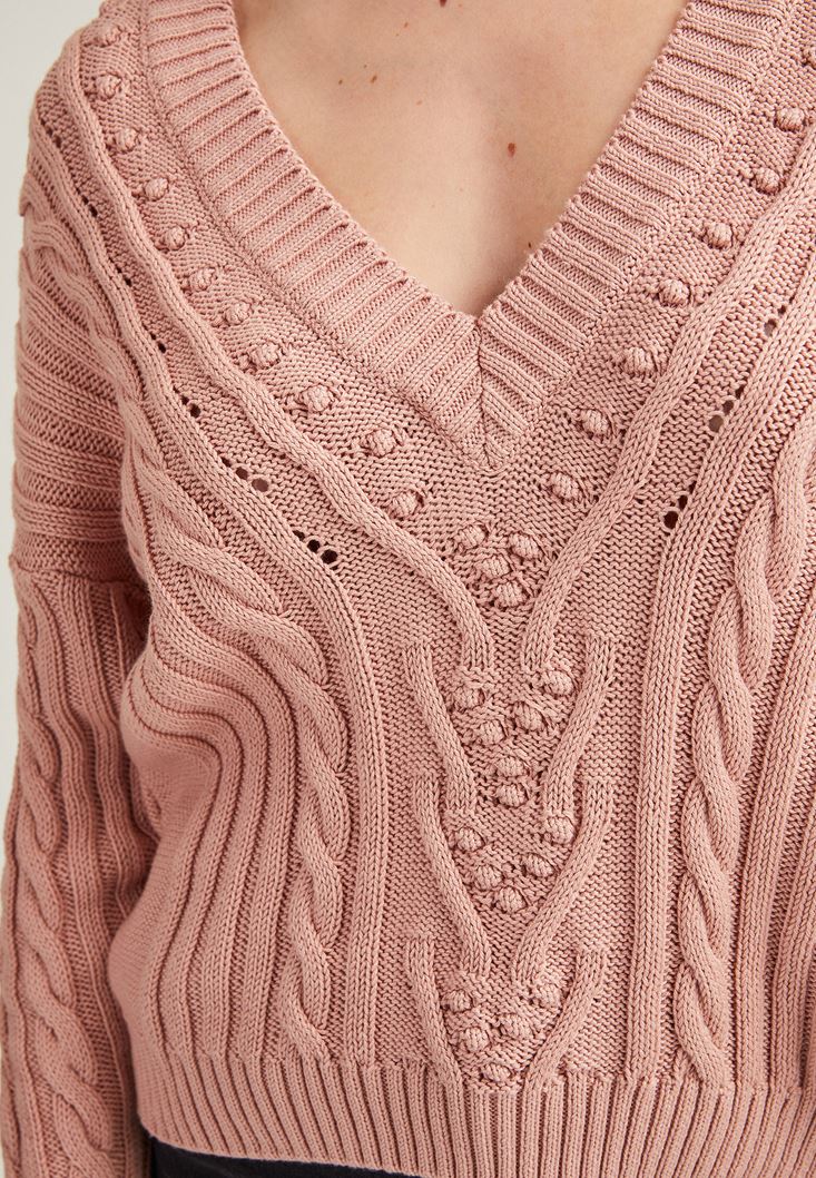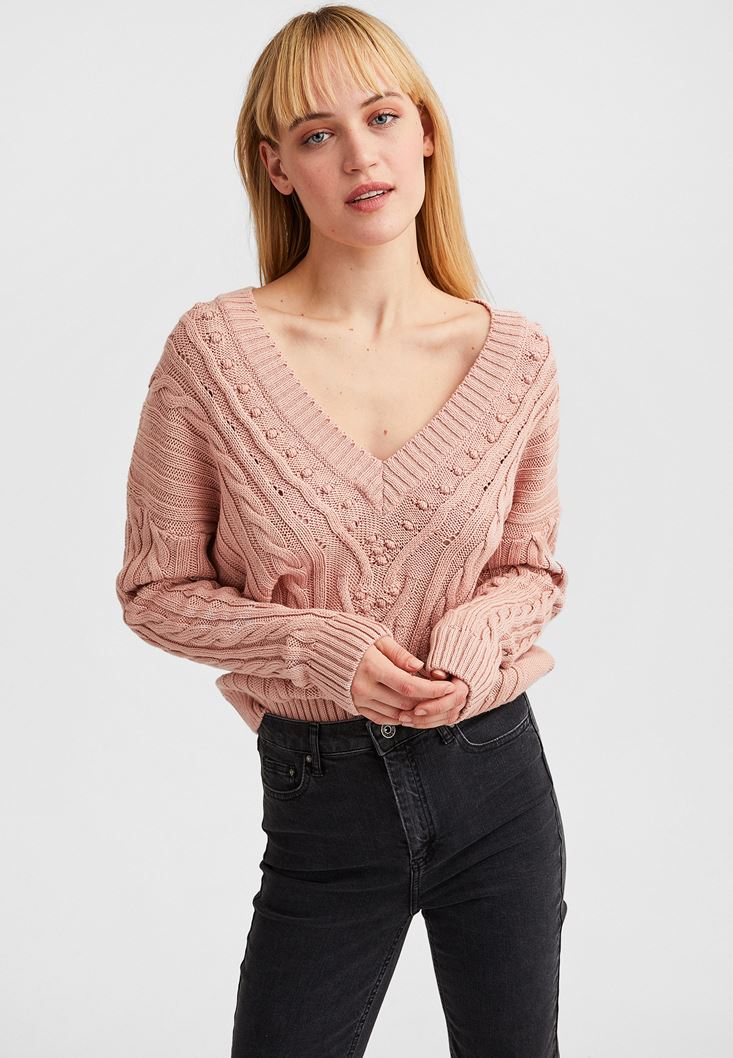 Pembe Örgü Detaylı V Yaka Triko