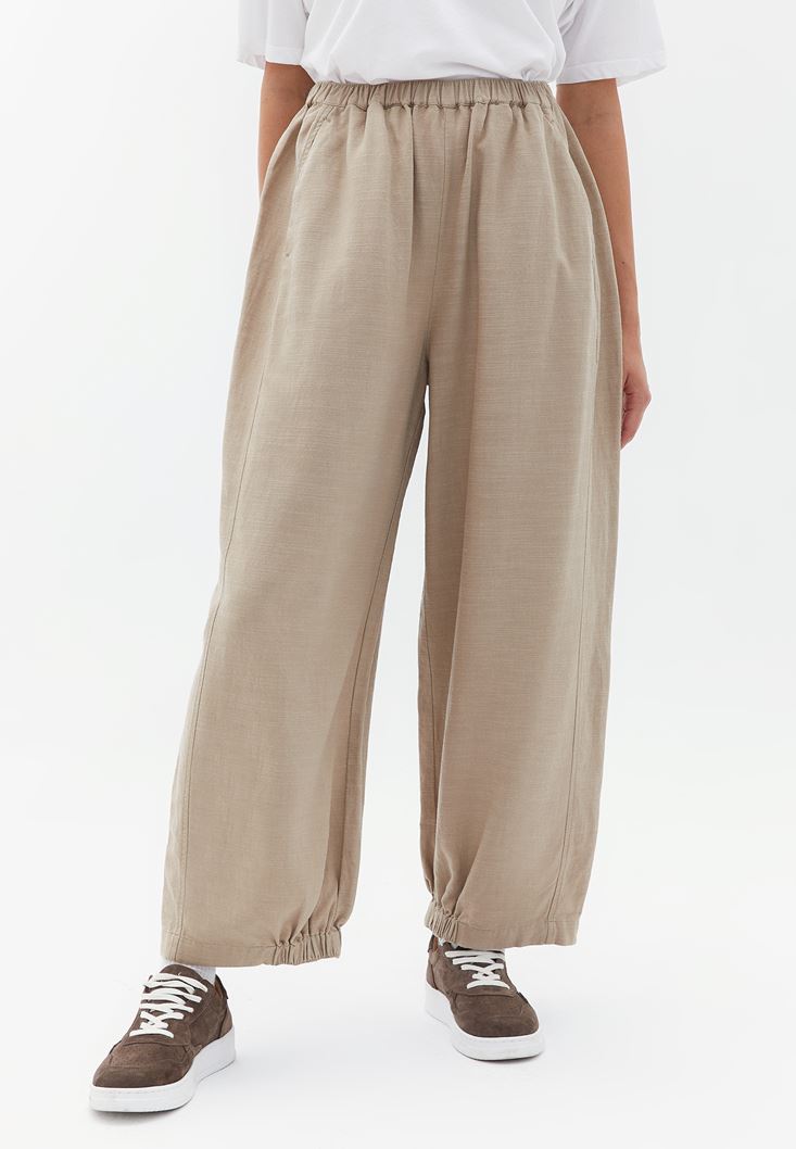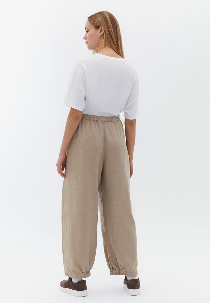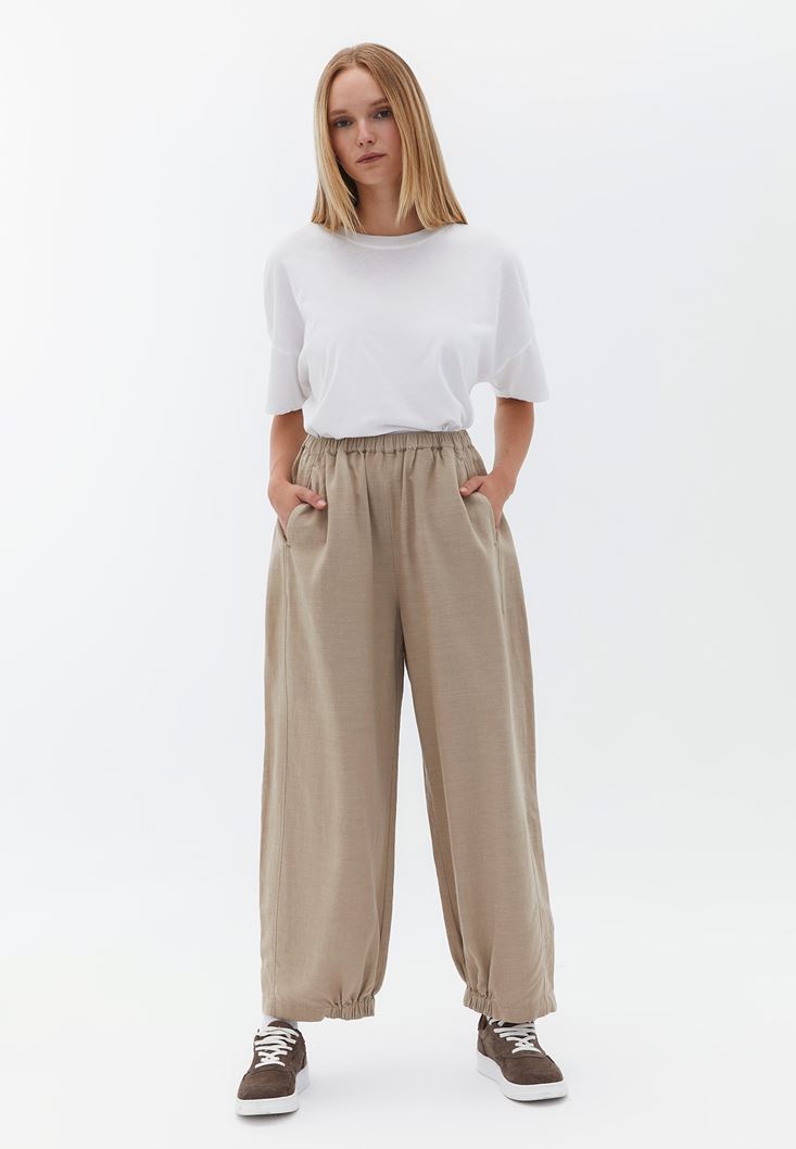 Pamuk ve viskon karışımlı içerik, orta bel yüksekliği, iki cepli, bedenden uzak baggy fit, beli lastikli, straight paça ve paçası yarım lastikli.