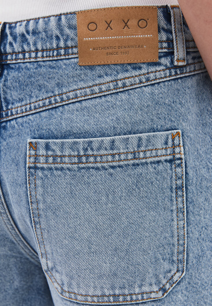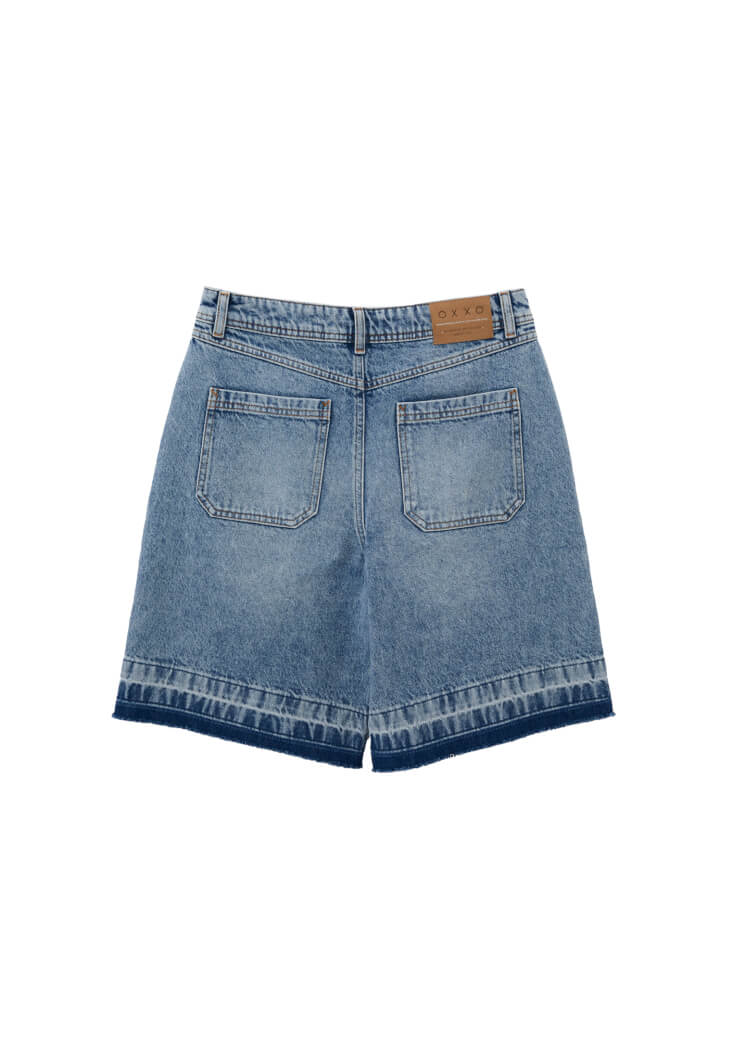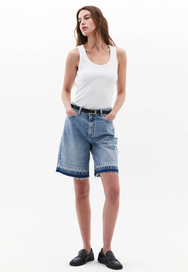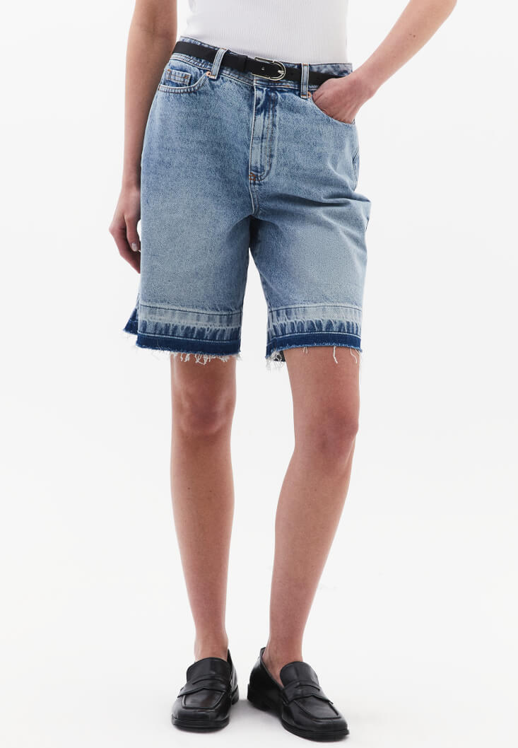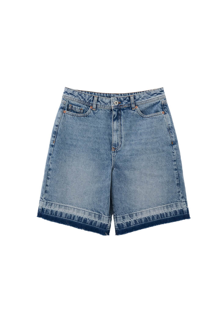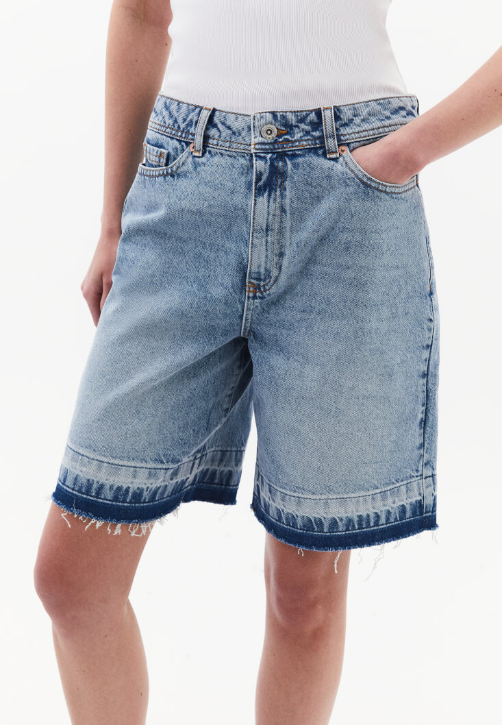 %100 pamuklu denim, bedene yakın rahat fit, orta bel, önü ve arkası ikişer cepli, midi bermuda kesim, paça ucu cut out detaylı.