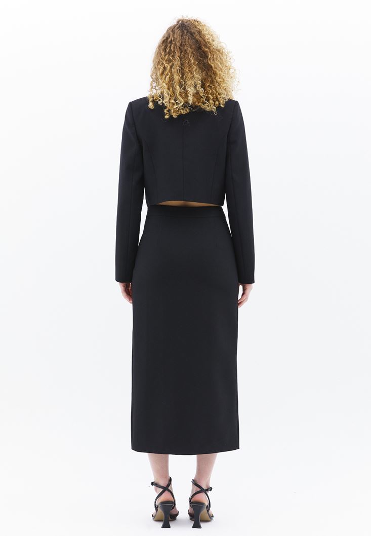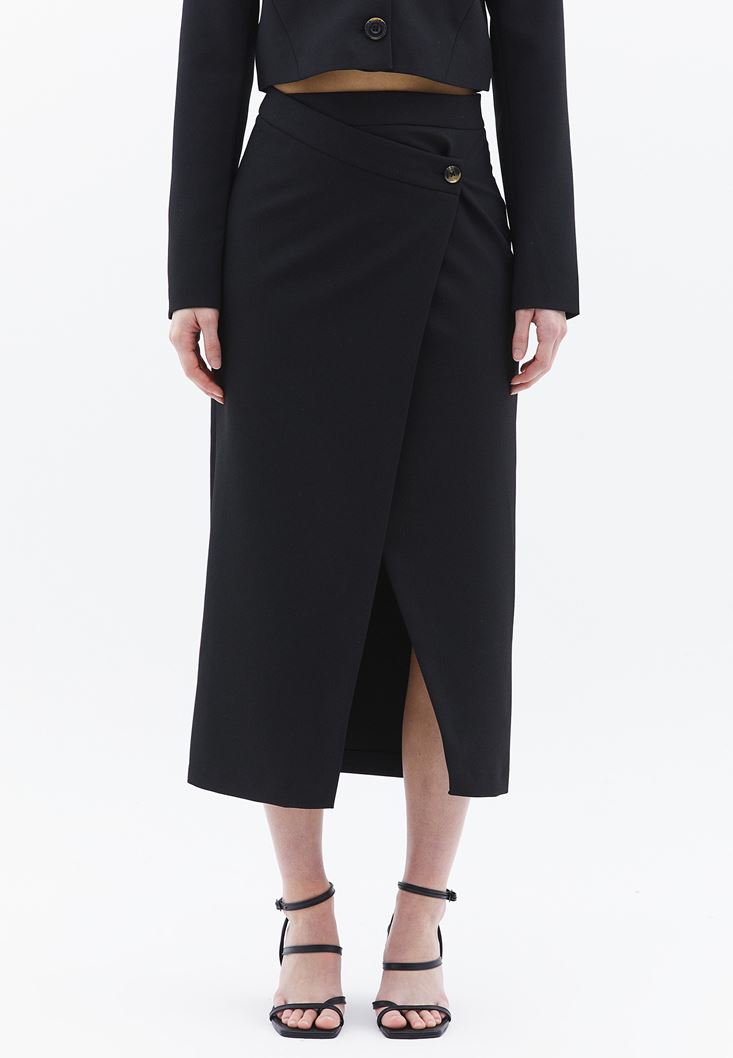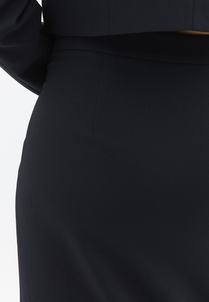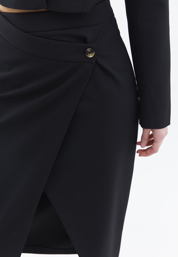 Siyah Orta Bel Düğme Detaylı Etek