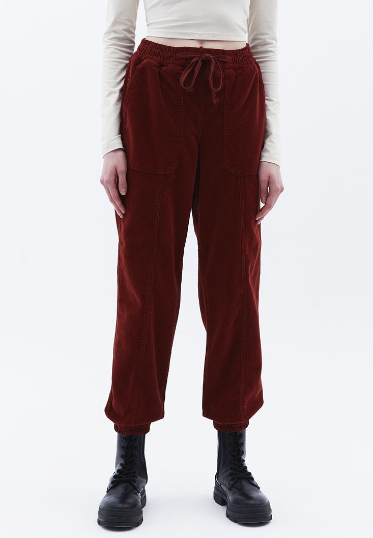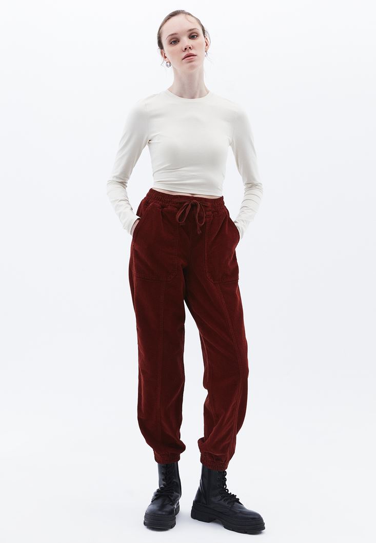 Bordo Orta Bel Kadife Jogger Pantolon