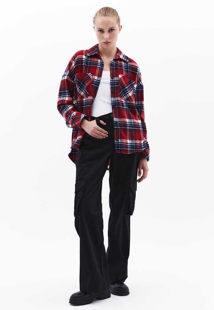 Pamuk karışımlı doku, orta bel, bedenden uzak straight fit, kargo cep detaylı, boru paça, üst kısmı iki cepli.