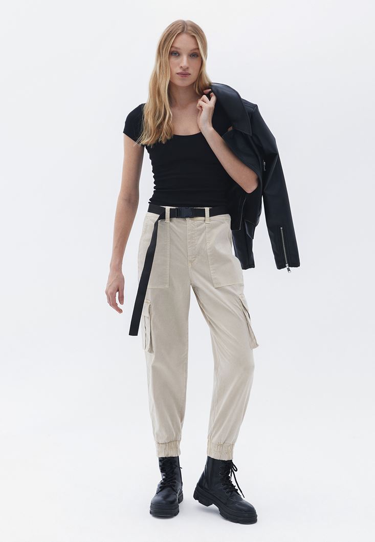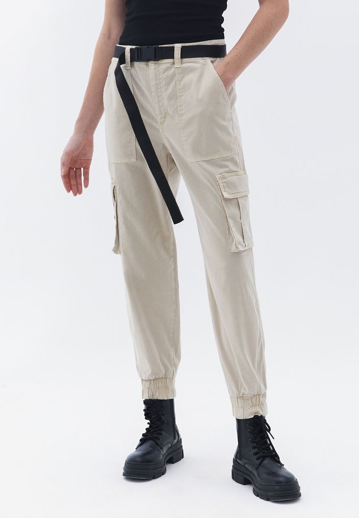Tencel(Lyocell) ve pamuk karışımlı geri dönüştürülebilir içerik, nefes alabilen anti bakteriyel doku, ara bel, bedene yakın jogger fit, kemerli, üst kısmı iki cepli, paçası lastikli, kargo cepli.