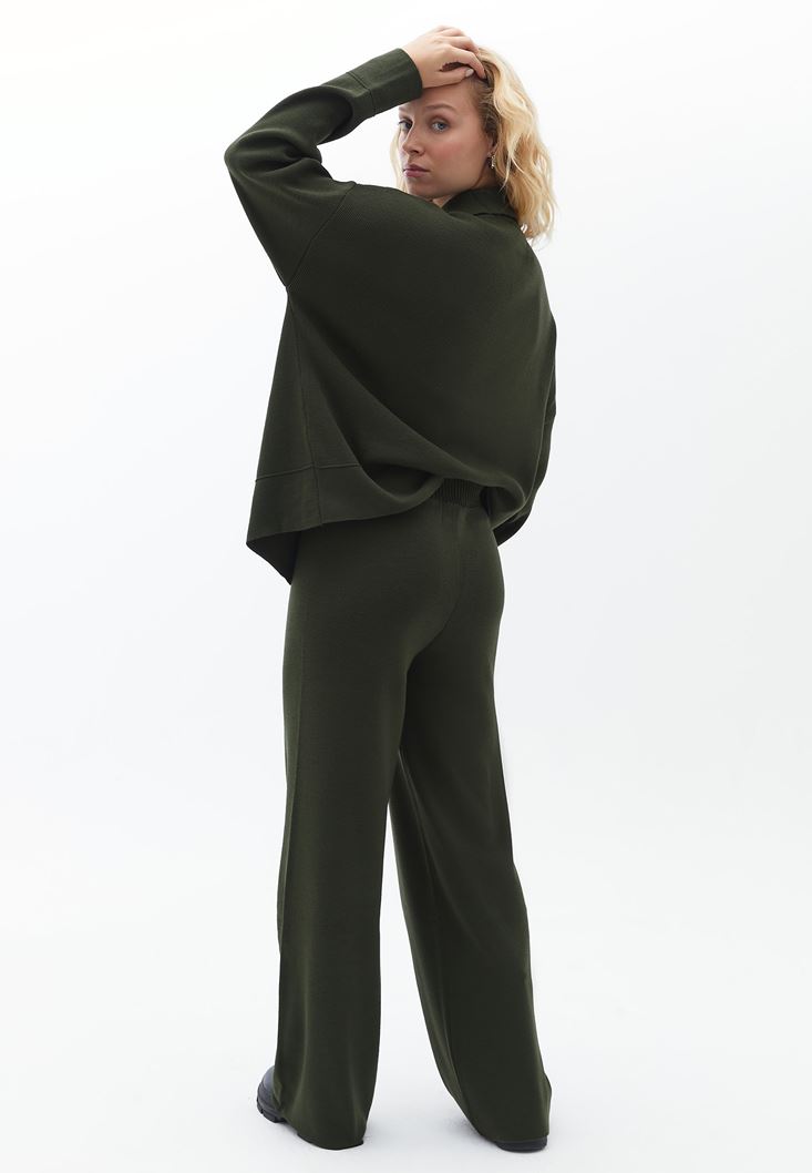 Özel triko örgü, orta bel, bedenden uzak relax fit, straight paça formu, beli jakarlı örgü.