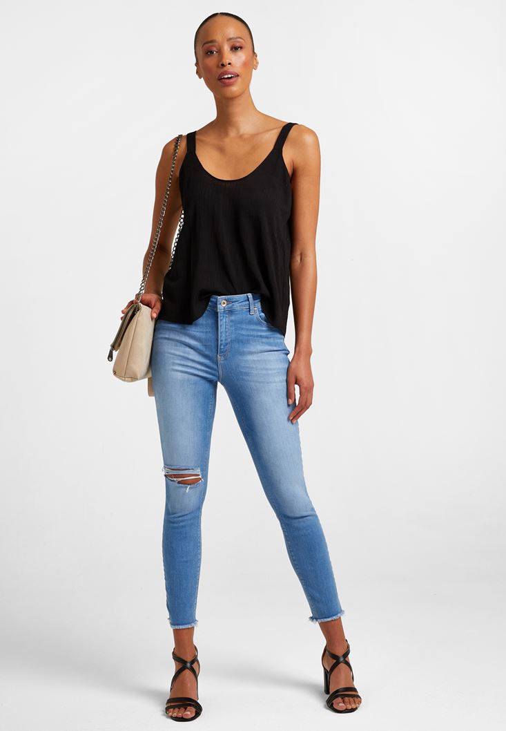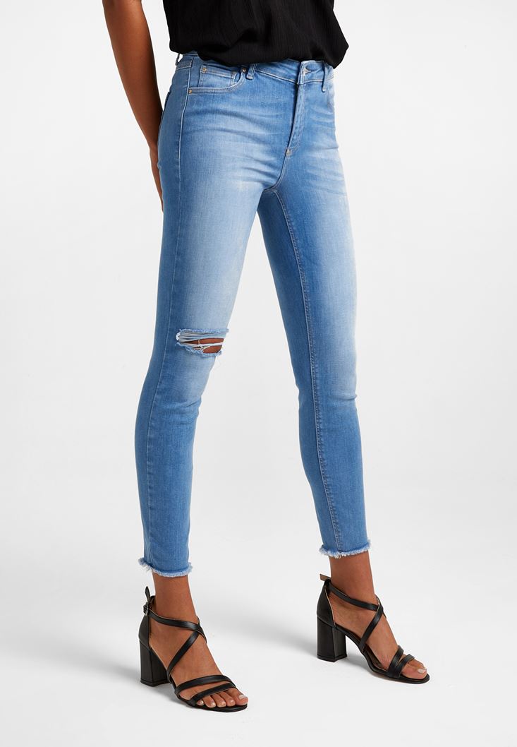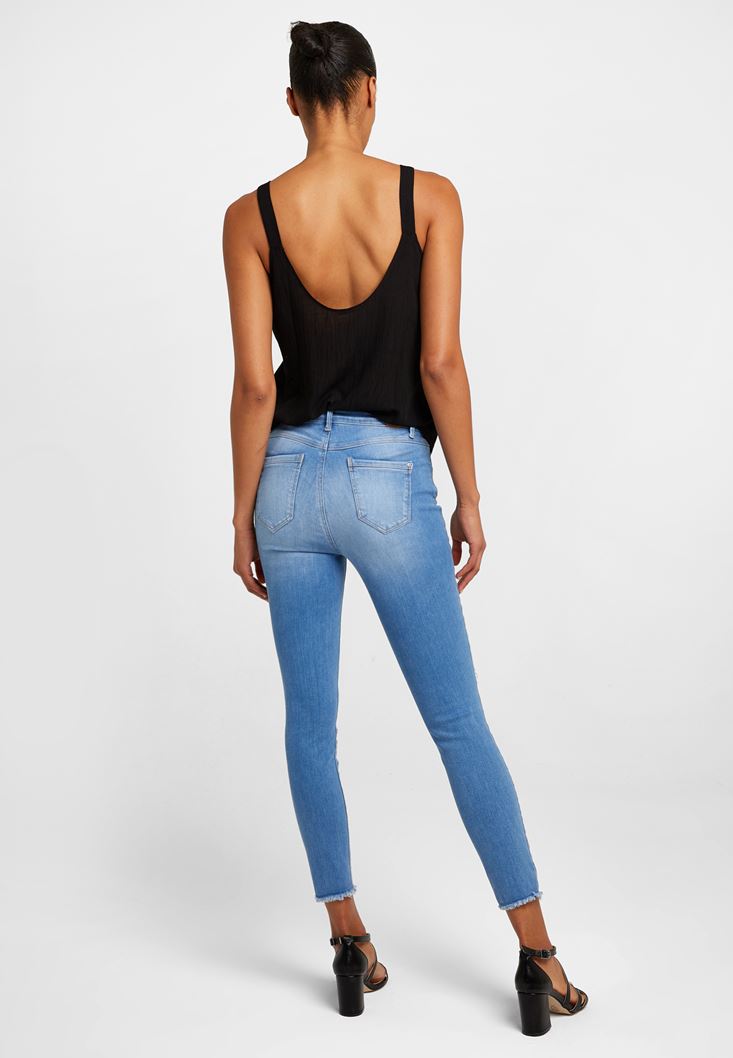Orta Bel Vücudu Saran Denim Pantolon modeli, pamuklu dokunun verdiği yumuşaklık ile sizleri buluşturuyor. kadın denim pantolon modeli, tek tarafta bulunan yırtık ayrıntısıyla hareketli bir görünüm sunuyor. Orta bel rahatlığı ile sizleri karşılayan kadın pantolon modeli, skinny formuyla bedeni toparlayan etkisini sunmayı da ihmal etmiyor. Kadın denim pantolon modeli ile kadın tişört modelleri ve kadın ceket modelleri kullanabildiğiniz harika kombinlere kolaylıkla ulaşabilirsiniz. Kombinlerinizde pratik kullanım imkanı sunan kadın pantolon modeli ile kadın sneaker veya kadın topuklu ayakkabı modelleri tercih ederek, hoş uyumlar yakalayabilirsiniz. Oxxo'nun bedeninizi narin bir şekilde saran kadın denim pantolon modelleri ile tarzınız en şık ve en son moda ayrıntılarla yansıtabilirsiniz.